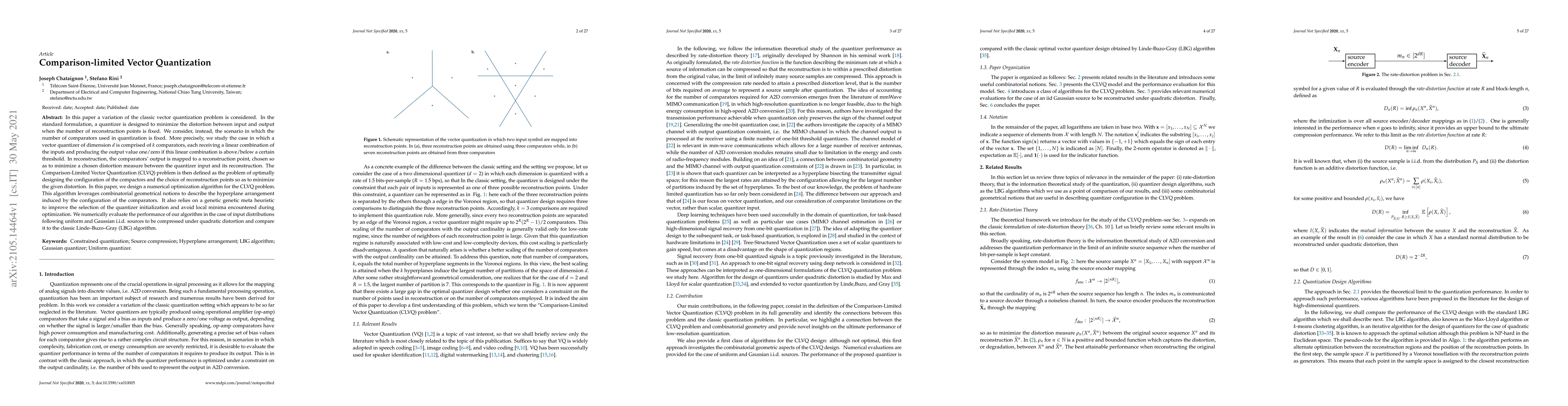 In this paper a variation of the classic vector quantization problem is considered. In the standard formulation, a quantizer is designed to minimize the distortion between input and output when the number of reconstruction points is fixed. We consider, instead, the scenario in which the number of comparators used in quantization is fixed. More precisely, we study the case in which a vector quantizer of dimension d is comprised of k comparators, each receiving a linear combination of the inputs and producing the output value one/zero if this linear combination is above/below a certain threshold. In reconstruction, the comparators' output is mapped to a reconstruction point, chosen so as to minimize a chosen distortion measure between the quantizer input and its reconstruction. The Comparison-Limited Vector Quantization (CLVQ) problem is then defined as the problem of optimally designing the configuration of the compactors and the choice of reconstruction points so as to minimize the given distortion. In this paper, we design a numerical optimization algorithm for the CLVQ problem. This algorithm leverages combinatorial geometrical notions to describe the hyperplane arrangement induced by the configuration of the comparators. It also relies on a genetic genetic meta heuristic to improve the selection of the quantizer initialization and avoid local minima encountered during optimization. We numerically evaluate the performance of our algorithm in the case of input distributions following uniform and Gaussian i.i.d. sources to be compressed under quadratic distortion and compare it to the classic Linde-Buzo-Gray (LBG) algorithm.