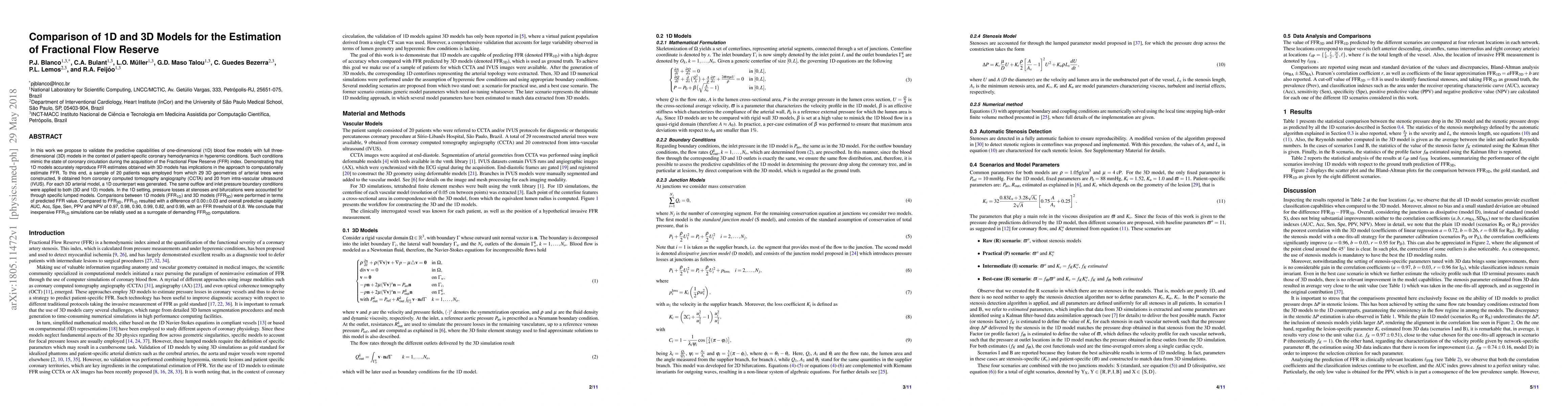 This study compares the predictive accuracy of 1D and 3D models for estimating Fractional Flow Reserve (FFR) in coronary hemodynamics. Results show that 1D models, with a mean difference of 0.00±0.03 in FFR estimates, provide reliable surrogates for more complex 3D models, with high predictive metrics.