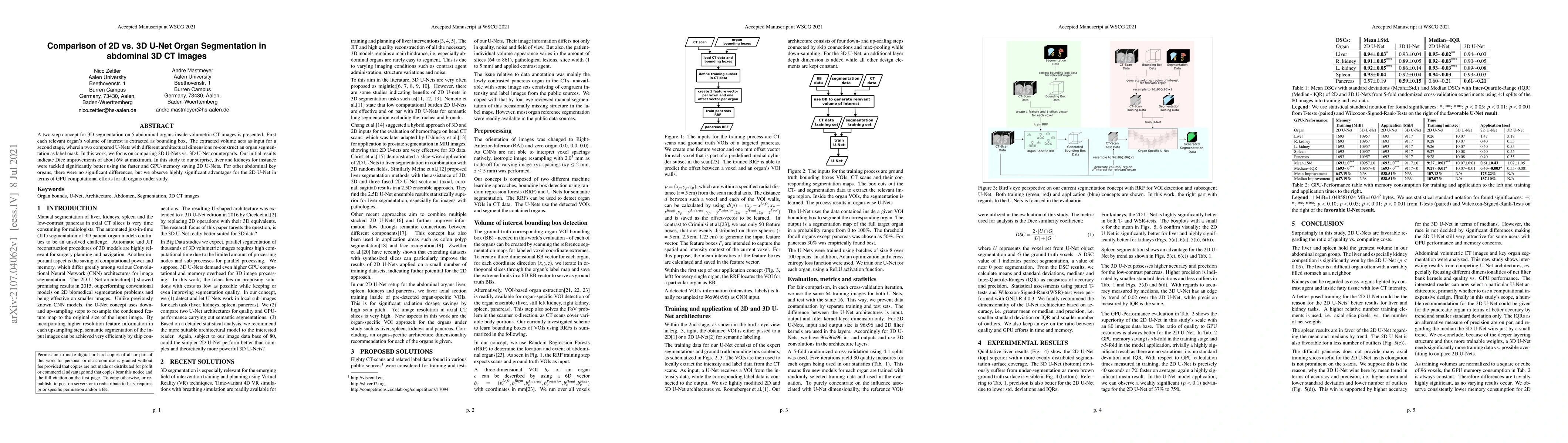A two-step concept for 3D segmentation on 5 abdominal organs inside volumetric CT images is presented. First each relevant organ's volume of interest is extracted as bounding box. The extracted volume acts as input for a second stage, wherein two compared U-Nets with different architectural dimensions re-construct an organ segmentation as label mask. In this work, we focus on comparing 2D U-Nets vs. 3D U-Net counterparts. Our initial results indicate Dice improvements of about 6\% at maximum. In this study to our surprise, liver and kidneys for instance were tackled significantly better using the faster and GPU-memory saving 2D U-Nets. For other abdominal key organs, there were no significant differences, but we observe highly significant advantages for the 2D U-Net in terms of GPU computational efforts for all organs under study.