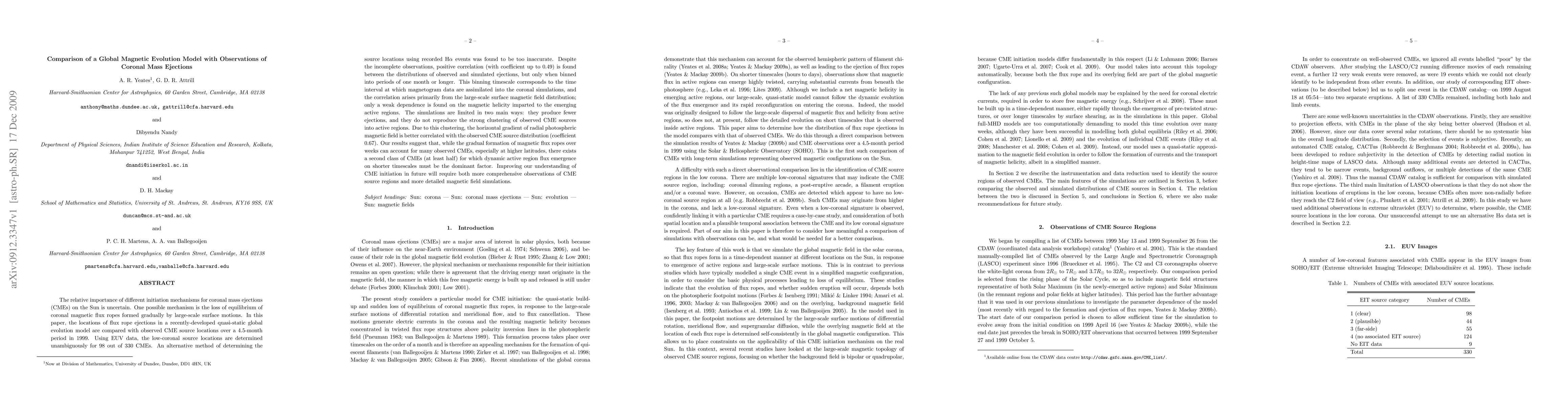 This study compares a global magnetic evolution model's predicted coronal mass ejection (CME) locations with observed CMEs, finding a positive correlation when data is binned over one month or longer. The model captures the gradual formation of magnetic flux ropes but fails to reproduce the clustering of CMEs in active regions.