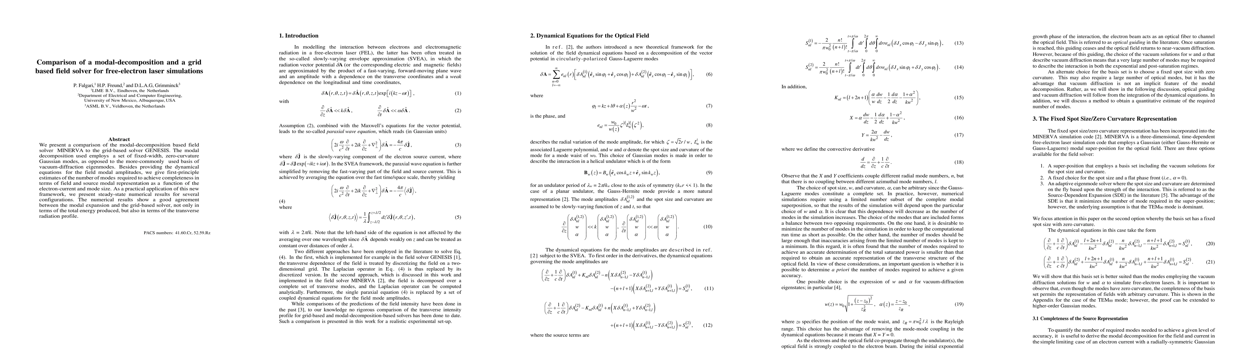 This paper compares the modal-decomposition solver MINERVA with the grid-based solver GENESIS for free-electron laser simulations, finding good agreement in total energy and radiation profiles. MINERVA uses fixed-width Gaussian modes instead of vacuum-diffraction eigenmodes, providing estimates for mode completeness based on electron current and mode size.