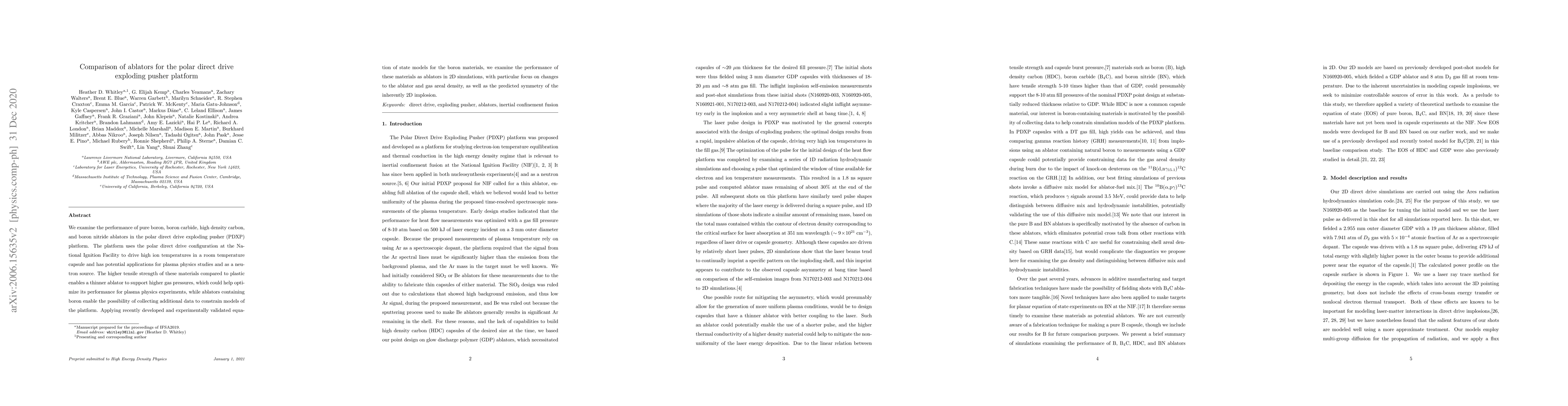 This paper compares the performance of various ablator materials—pure boron, boron carbide, high density carbon, and boron nitride—in the polar direct drive exploding pusher (PDXP) platform at the National Ignition Facility. The study uses 2D simulations to evaluate how these materials affect ablator and gas areal density, implosion symmetry, and overall platform performance for plasma physics experiments and neutron source applications.