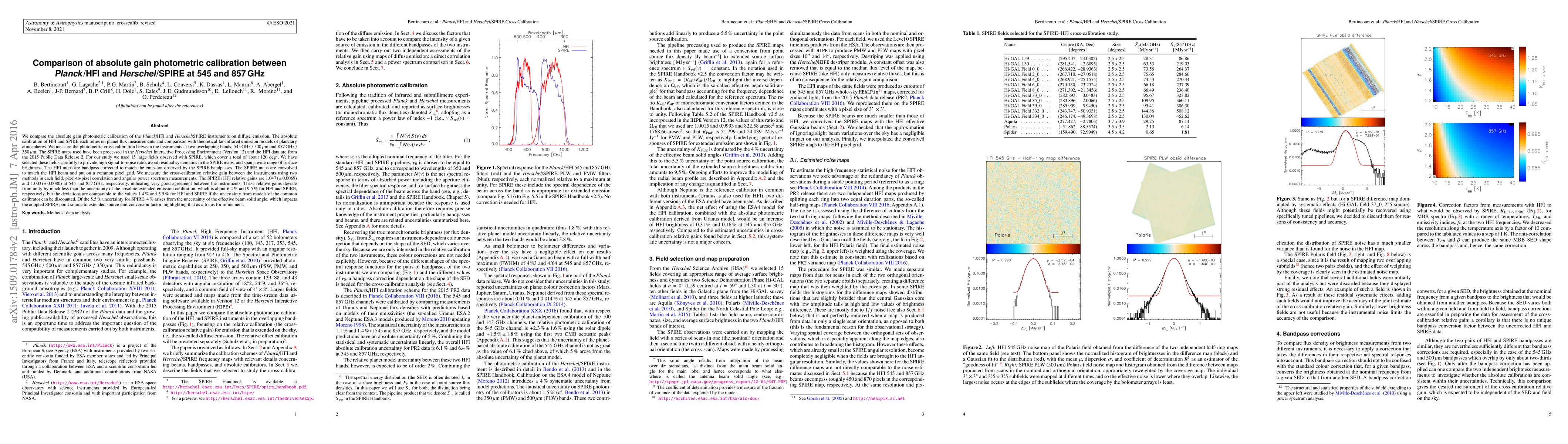 We compare the absolute gain photometric calibration of the Planck/HFI and Herschel/SPIRE instruments on diffuse emission. The absolute calibration of HFI and SPIRE each relies on planet flux measurements and comparison with theoretical far-infrared emission models of planetary atmospheres. We measure the photometric cross calibration between the instruments at two overlapping bands, 545 GHz / 500 $\mu$m and 857 GHz / 350 $\mu$m. The SPIRE maps used have been processed in the Herschel Interactive Processing Environment (Version 12) and the HFI data are from the 2015 Public Data Release 2. For our study we used 15 large fields observed with SPIRE, which cover a total of about 120 deg^2. We have selected these fields carefully to provide high signal-to-noise ratio, avoid residual systematics in the SPIRE maps, and span a wide range of surface brightness. The HFI maps are bandpass-corrected to match the emission observed by the SPIRE bandpasses. The SPIRE maps are convolved to match the HFI beam and put on a common pixel grid. We measure the cross-calibration relative gain between the instruments using two methods in each field, pixel-to-pixel correlation and angular power spectrum measurements. The SPIRE / HFI relative gains are 1.047 ($\pm$ 0.0069) and 1.003 ($\pm$ 0.0080) at 545 and 857 GHz, respectively, indicating very good agreement between the instruments. These relative gains deviate from unity by much less than the uncertainty of the absolute extended emission calibration, which is about 6.4% and 9.5% for HFI and SPIRE, respectively, but the deviations are comparable to the values 1.4% and 5.5% for HFI and SPIRE if the uncertainty from models of the common calibrator can be discounted. Of the 5.5% uncertainty for SPIRE, 4% arises from the uncertainty of the effective beam solid angle, which impacts the adopted SPIRE point source to extended source unit conversion factor (Abridged)