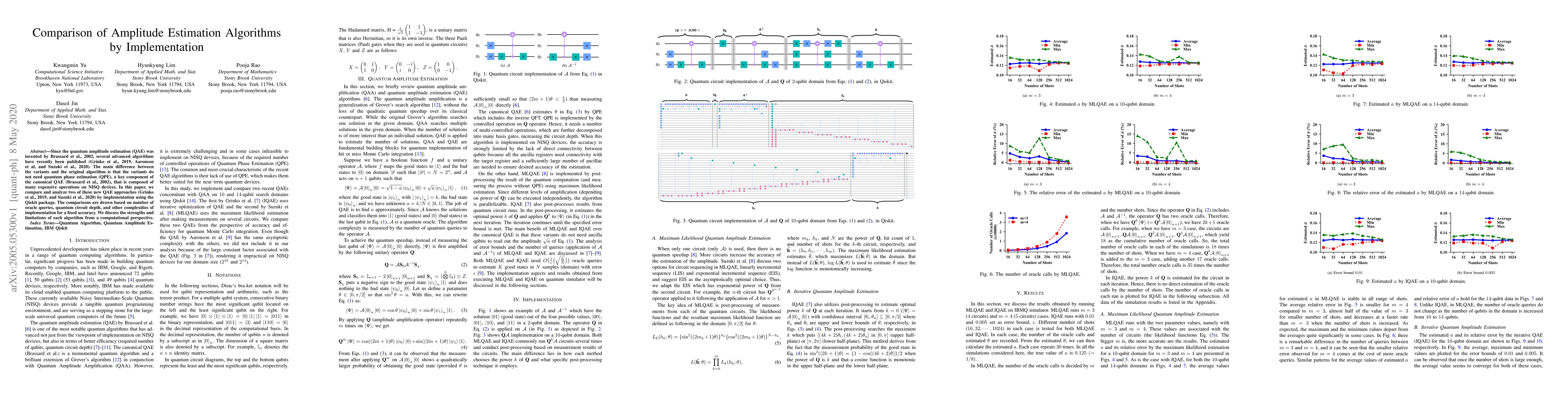Since the quantum amplitude estimation (QAE) was invented by Brassard et al., 2002, several advanced algorithms have recently been published (Grinko et al., 2019, Aaronson et al, and Suzuki et al., 2020). The main difference between the variants and the original algorithm is that the variants do not need quantum phase estimation (QPE), a key component of the canonical QAE (Brassard et al., 2002), that is composed of many expensive operations on NISQ devices. In this paper, we compare and analyze two of these new QAE approaches (Grinko et al., 2019, and Suzuki et al., 2020) by implementation using the Qiskit package. The comparisons are drawn based on number of oracle queries, quantum circuit depth, and other complexities of implementation for a fixed accuracy. We discuss the strengths and limitations of each algorithm from a computational perspective.