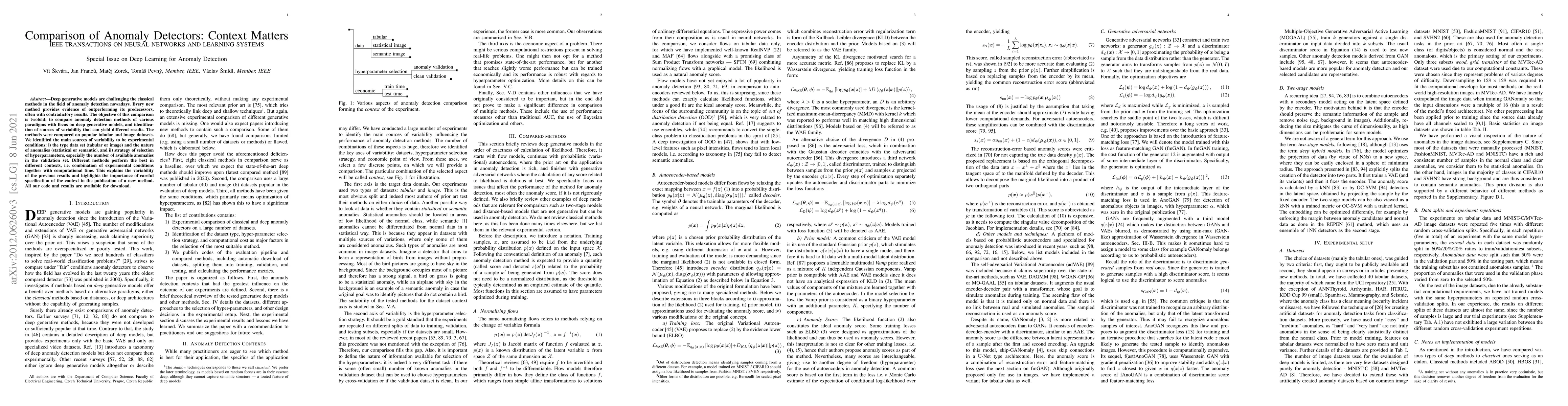 Deep generative models are challenging the classical methods in the field of anomaly detection nowadays. Every new method provides evidence of outperforming its predecessors, often with contradictory results. The objective of this comparison is twofold: to compare anomaly detection methods of various paradigms with focus on deep generative models, and identification of sources of variability that can yield different results. The methods were compared on popular tabular and image datasets. We identified the main sources of variability to be experimental conditions: i) the type data set (tabular or image) and the nature of anomalies (statistical or semantic), and ii) strategy of selection of hyperparameters, especially the number of available anomalies in the validation set. Different methods perform the best in different contexts, i.e. combination of experimental conditions together with computational time. This explains the variability of the previous results and highlights the importance of careful specification of the context in the publication of a new method. All our code and results are available for download.