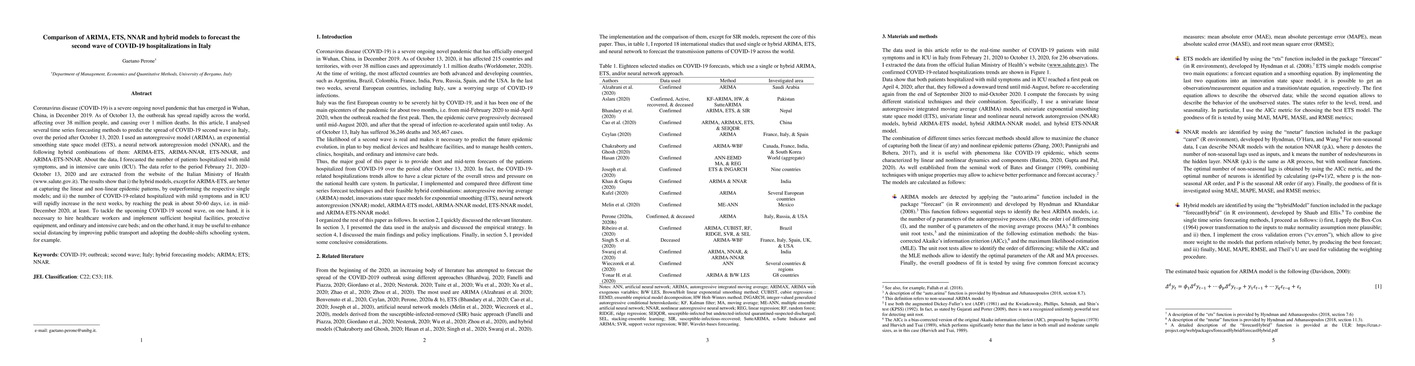 This paper compares ARIMA, ETS, NNAR, and hybrid models to forecast the second wave of COVID-19 hospitalizations in Italy, finding that hybrid models, except ARIMA-ETS, better predict the spread. The study projects a peak in hospitalizations in mid-December 2020, emphasizing the need for increased healthcare resources and social distancing measures.