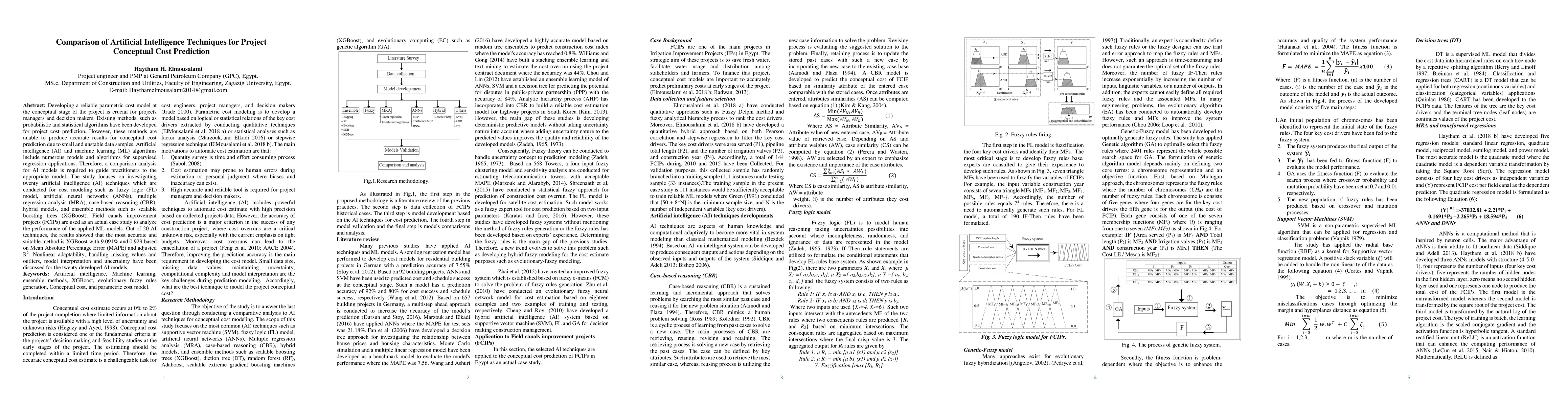 Developing a reliable parametric cost model at the conceptual stage of the project is crucial for projects managers and decision-makers. Existing methods, such as probabilistic and statistical algorithms have been developed for project cost prediction. However, these methods are unable to produce accurate results for conceptual cost prediction due to small and unstable data samples. Artificial intelligence (AI) and machine learning (ML) algorithms include numerous models and algorithms for supervised regression applications. Therefore, a comparison analysis for AI models is required to guide practitioners to the appropriate model. The study focuses on investigating twenty artificial intelligence (AI) techniques which are conducted for cost modeling such as fuzzy logic (FL) model, artificial neural networks (ANNs), multiple regression analysis (MRA), case-based reasoning (CBR), hybrid models, and ensemble methods such as scalable boosting trees (XGBoost). Field canals improvement projects (FCIPs) are used as an actual case study to analyze the performance of the applied ML models. Out of 20 AI techniques, the results showed that the most accurate and suitable method is XGBoost with 9.091% and 0.929 based on Mean Absolute Percentage Error (MAPE) and adjusted R2. Nonlinear adaptability, handling missing values and outliers, model interpretation and uncertainty have been discussed for the twenty developed AI models. Keywords: Artificial intelligence, Machine learning, ensemble methods, XGBoost, evolutionary fuzzy rules generation, Conceptual cost, and parametric cost model.