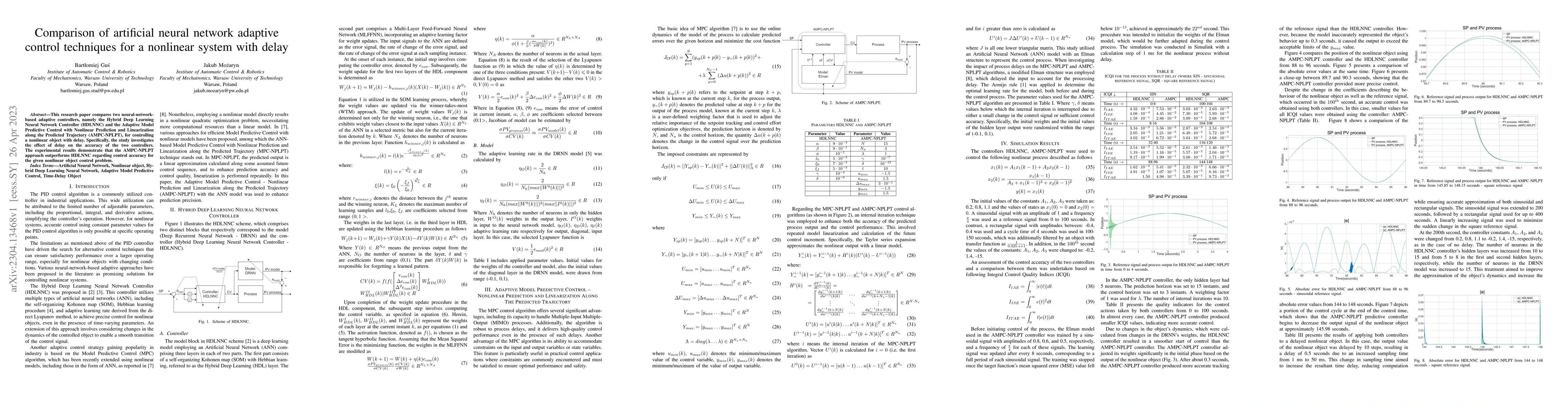 This paper compares two adaptive neural-network controllers, HDLNNC and AMPC-NPLPT, for controlling a nonlinear system with delay. The results show that AMPC-NPLPT achieves higher control accuracy than HDLNNC.