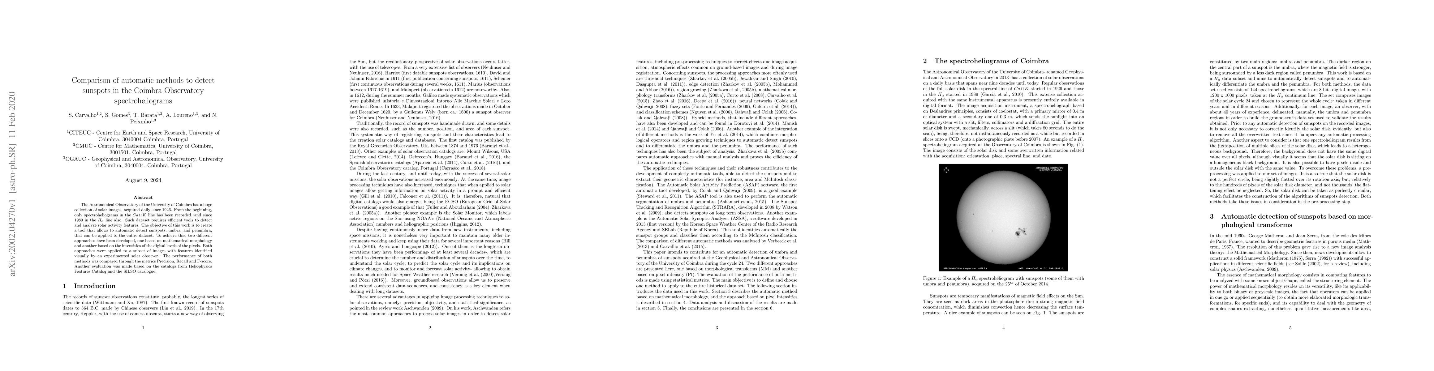 The Astronomical Observatory of the University of Coimbra has a huge collection of solar images, acquired daily since 1926. From the beginning, only spectroheliograms in the CaiiK line has been recorded, and since 1989 in the H_alpha line also. Such dataset requires efficient tools to detect and analyze solar activity features. The objective of this work is to create a tool that allows to automatic detect sunspots, umbra, and penumbra, that can be applied to the entire dataset. To achieve this, two different approaches have been developed, one based on mathematical morphology and another based on the intensities of the digital levels of the pixels. Both approaches were applied to a subset of images with features identified visually by an experimented solar observer. The performance of both methods was compared through the metrics Precision, Recall and F-score. Another evaluation was made based on the catalogs from Heliophysics Features Catalog and the SILSO catalogue.