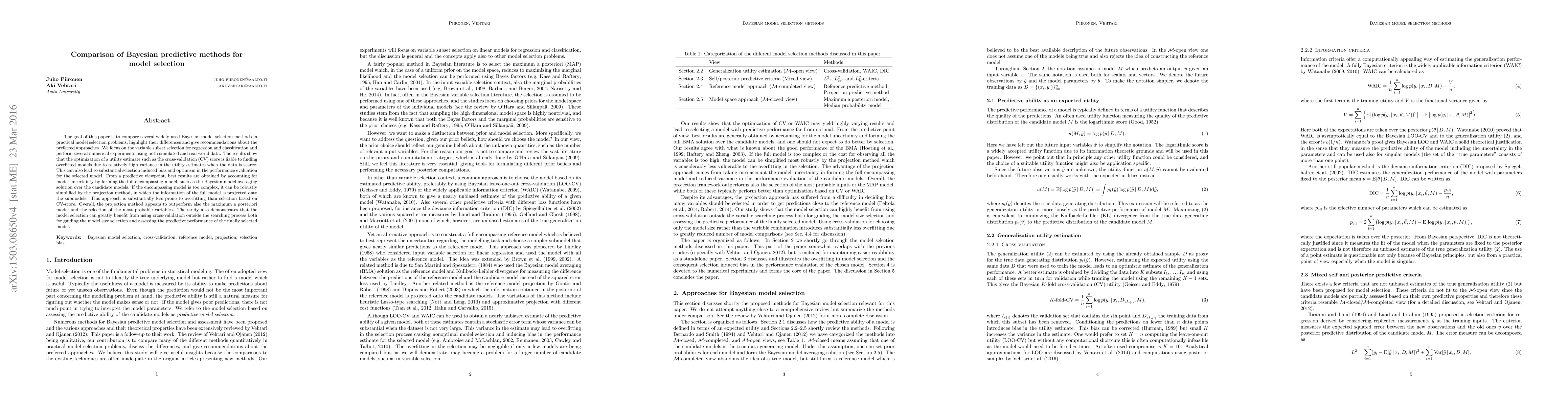 This paper compares various Bayesian model selection methods, finding that Bayesian model averaging and the projection method yield better predictive performance by accounting for model uncertainty, while cross-validation-based optimization can lead to overfitting and bias. The study recommends using cross-validation outside the selection process for better model size selection and performance assessment.