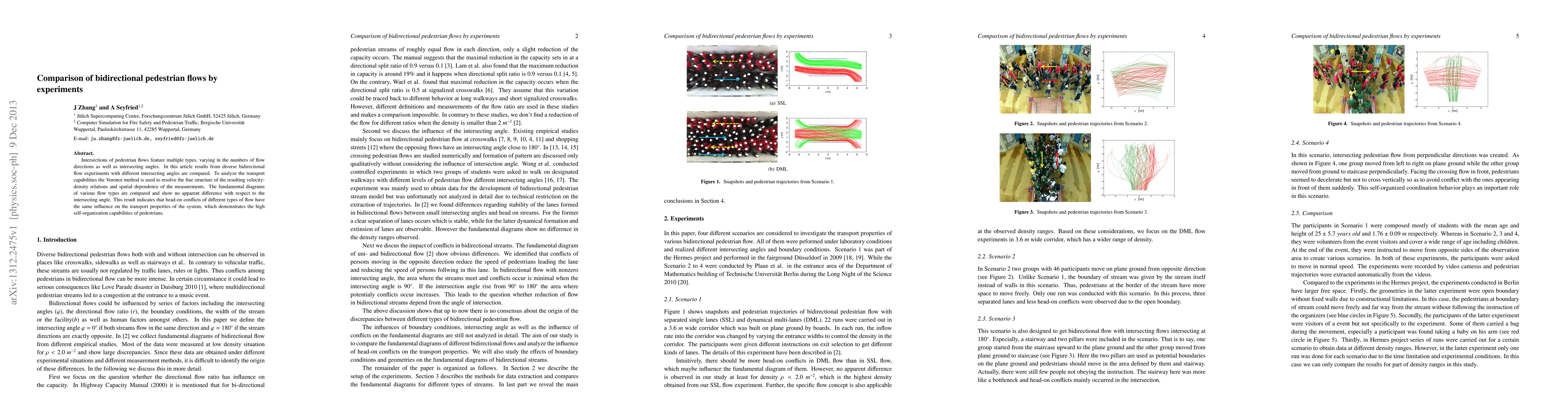 This study compares bidirectional pedestrian flows at intersections with varying intersecting angles through experiments. The Voronoi method reveals that the fundamental diagrams remain consistent regardless of angle, indicating pedestrians' high self-organization in managing conflicting flows.