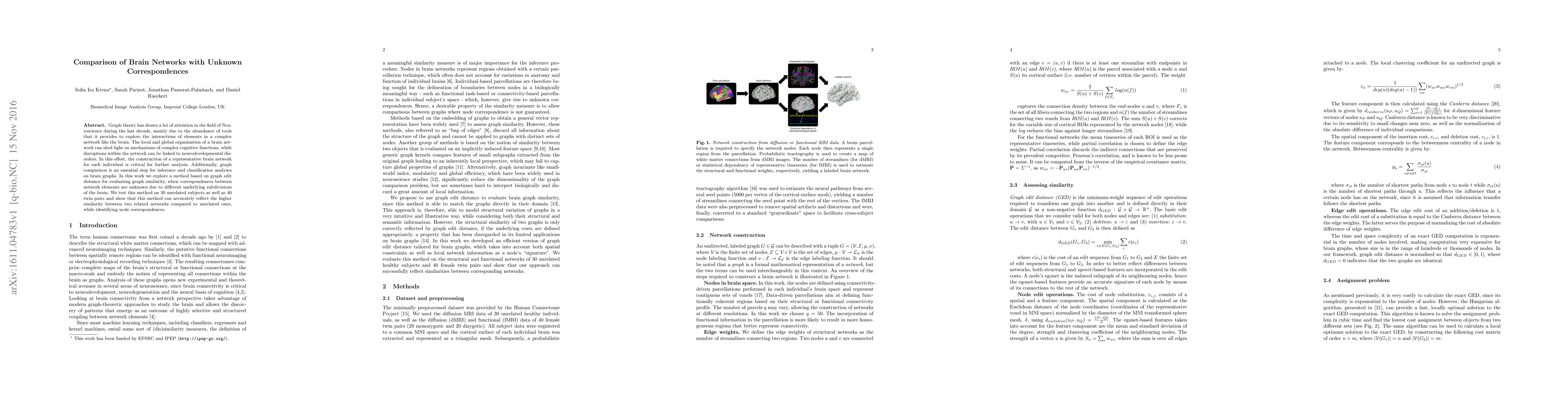 This paper proposes a graph edit distance method for comparing brain networks where the correspondences between network elements are unknown. The method is tested on 30 unrelated subjects and 40 twin pairs, demonstrating its ability to accurately reflect higher similarity in related networks.