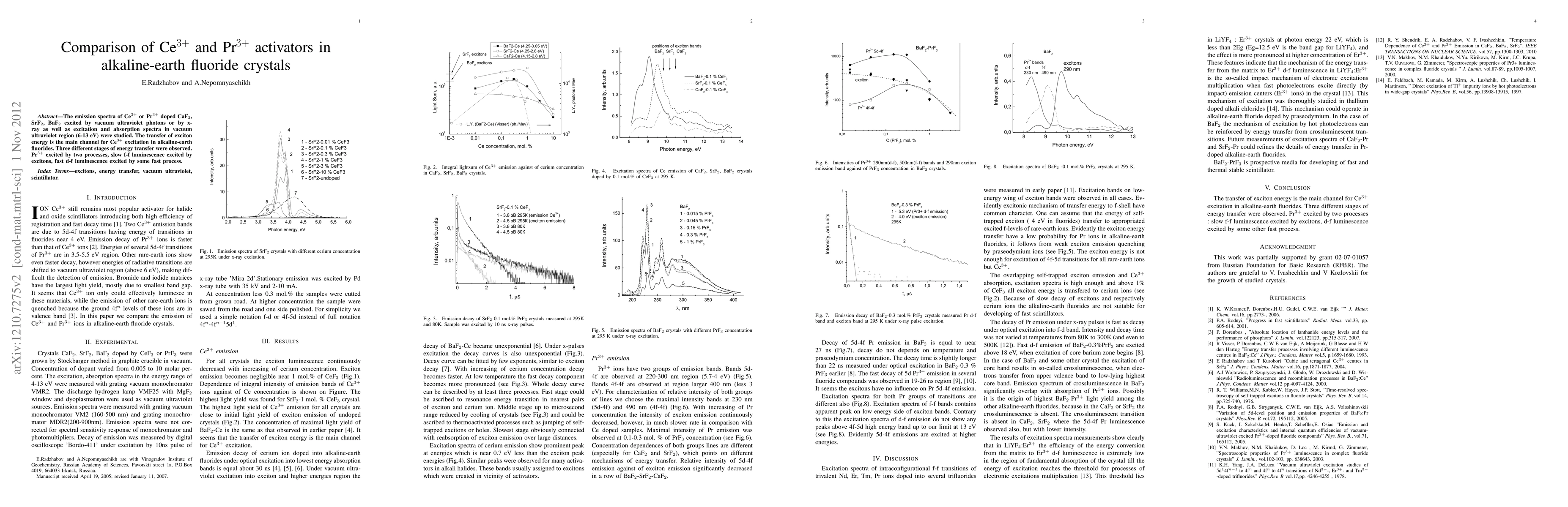 Researchers studied the emission spectra of Ce$^{3+}$ and Pr$^{3+}$ doped alkaline-earth fluoride crystals under different excitation conditions, revealing distinct energy transfer mechanisms for each activator.