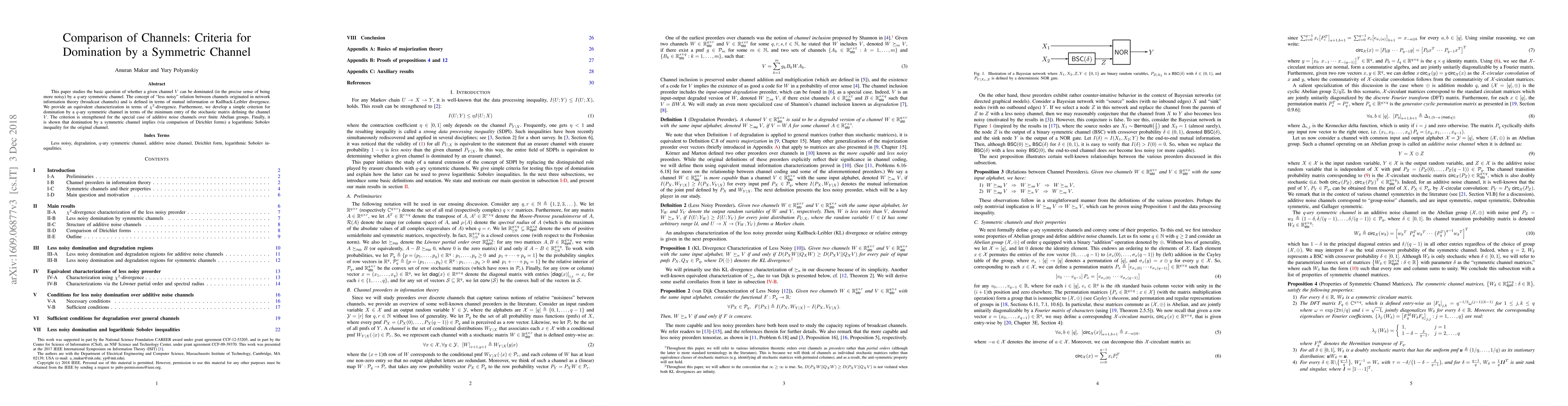 This paper studies the basic question of whether a given channel $V$ can be dominated (in the precise sense of being more noisy) by a $q$-ary symmetric channel. The concept of "less noisy" relation between channels originated in network information theory (broadcast channels) and is defined in terms of mutual information or Kullback-Leibler divergence. We provide an equivalent characterization in terms of $\chi^2$-divergence. Furthermore, we develop a simple criterion for domination by a $q$-ary symmetric channel in terms of the minimum entry of the stochastic matrix defining the channel $V$. The criterion is strengthened for the special case of additive noise channels over finite Abelian groups. Finally, it is shown that domination by a symmetric channel implies (via comparison of Dirichlet forms) a logarithmic Sobolev inequality for the original channel.