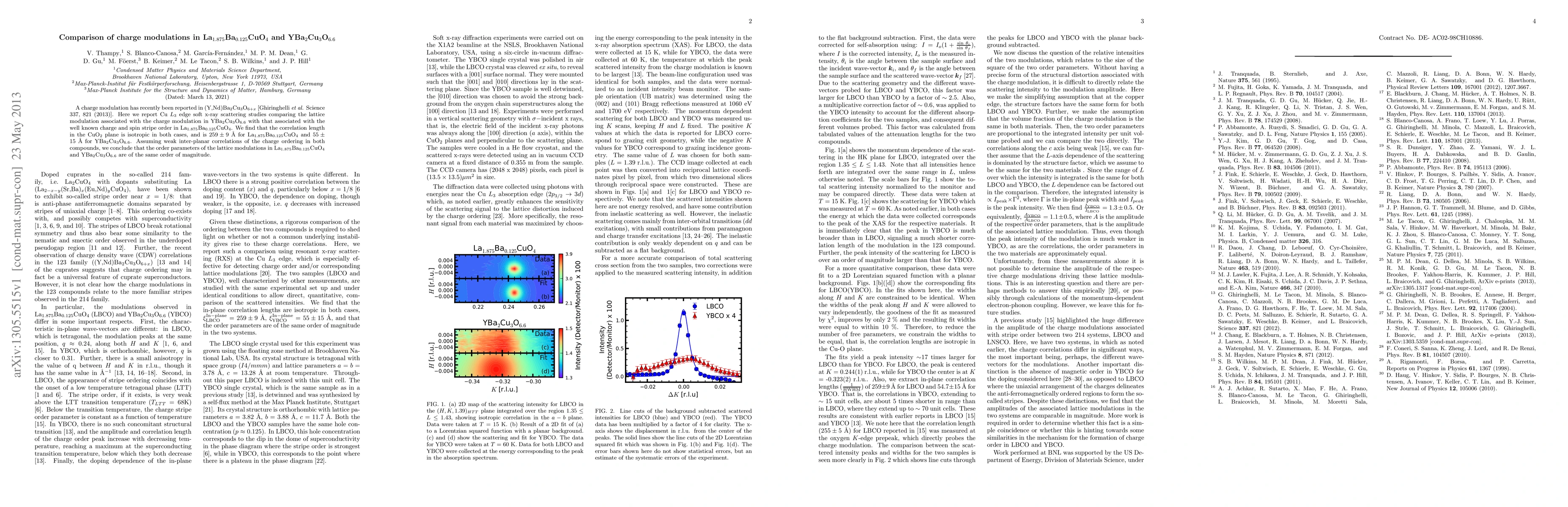 This study compares charge modulations in two high-temperature superconductors, La$_{1.875}$Ba$_{0.125}$CuO$_4$ and YBa$_2$Cu$_3$O$_{6.6}$, finding that the correlation length of lattice modulations in the CuO$_2$ plane is larger in La$_{1.875}$Ba$_{0.125}$CuO$_4$ ($259 \pm 9$ Å) compared to YBa$_2$Cu$_3$O$_{6.6}$ ($55 \pm 15$ Å), yet their order parameters are of similar magnitude.