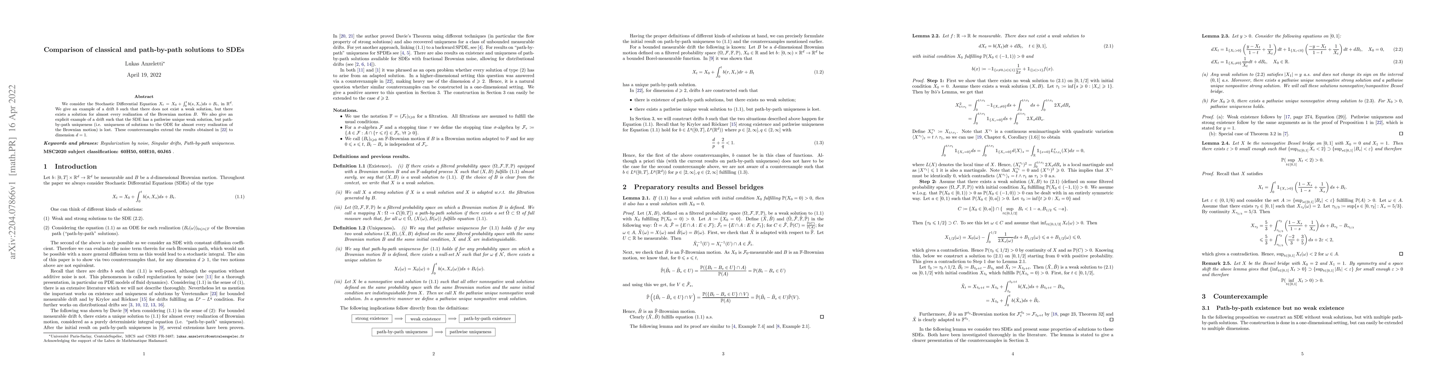 This paper compares solutions to stochastic differential equations (SDEs) using classical and path-by-path methods, finding counterexamples where one approach yields a solution while the other does not.