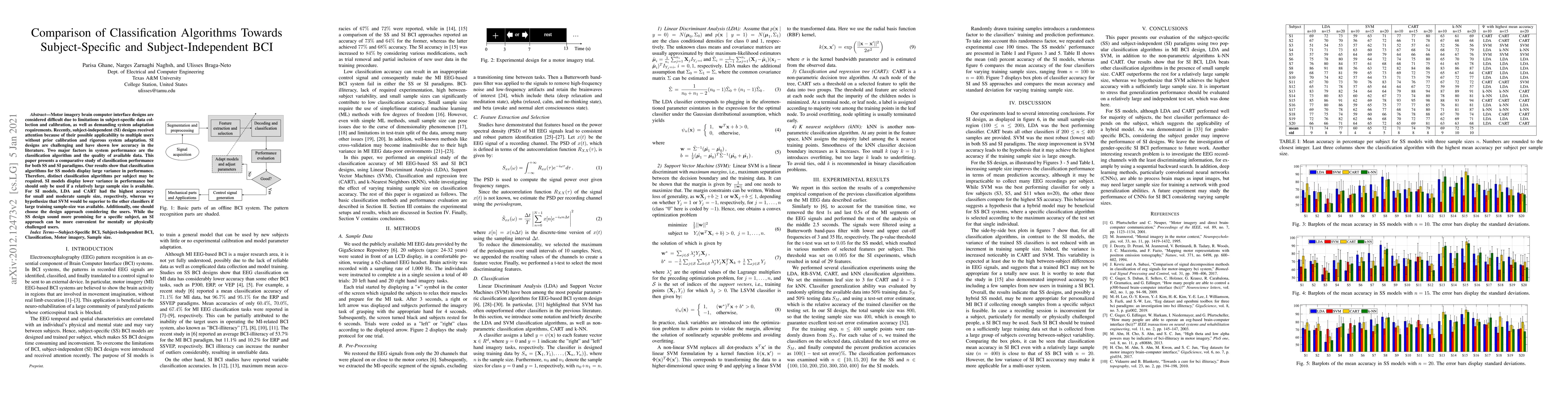 This paper compares classification algorithms for subject-specific and subject-independent brain-computer interfaces, finding that subject-specific models require distinct algorithms per user due to performance variance, while subject-independent models show lower variance but require larger sample sizes, with LDA and CART performing best for smaller datasets and SVM potentially superior for larger ones.