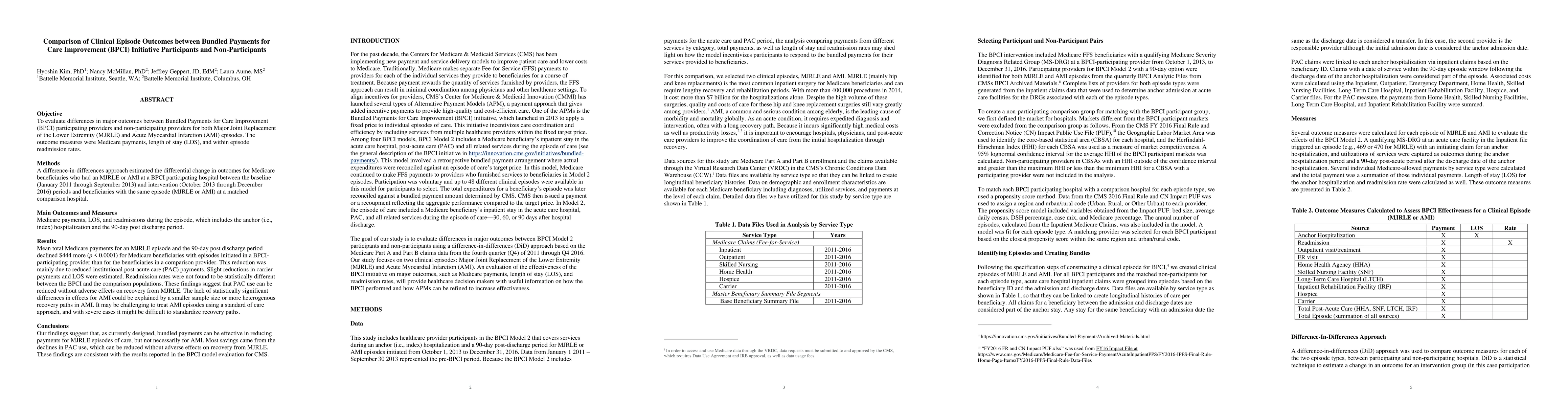 Objective: To evaluate differences in major outcomes between Bundled Payments for Care Improvement (BPCI) participating providers and non-participating providers for both Major Joint Replacement of the Lower Extremity (MJRLE) and Acute Myocardial Infarction (AMI) episodes. Methods: A difference-in-differences approach estimated the differential change in outcomes for Medicare beneficiaries who had an MJRLE or AMI at a BPCI participating hospital between the baseline (January 2011 through September 2013) and intervention (October 2013 through December 2016) periods and beneficiaries with the same episode (MJRLE or AMI) at a matched comparison hospital. Main Outcomes and Measures: Medicare payments, LOS, and readmissions during the episode, which includes the anchor hospitalization and the 90-day post discharge period. Results: Mean total Medicare payments for an MJRLE episode and the 90-day post discharge period declined $444 more (p < 0.0001) for Medicare beneficiaries with episodes initiated in a BPCI-participating provider than for the beneficiaries in a comparison provider. This reduction was mainly due to reduced institutional post-acute care (PAC) payments. Slight reductions in carrier payments and LOS were estimated. Readmission rates were not statistically different between the BPCI and the comparison populations. These findings suggest that PAC use can be reduced without adverse effects on recovery from MJRLE. The lack of statistically significant differences in effects for AMI could be explained by a smaller sample size or more heterogenous recovery paths in AMI. Conclusions: Our findings suggest that, as currently designed, bundled payments can be effective in reducing payments for MJRLE episodes of care, but not necessarily for AMI. Most savings came from the declines in PAC. These findings are consistent with the results reported in the BPCI model evaluation for CMS.