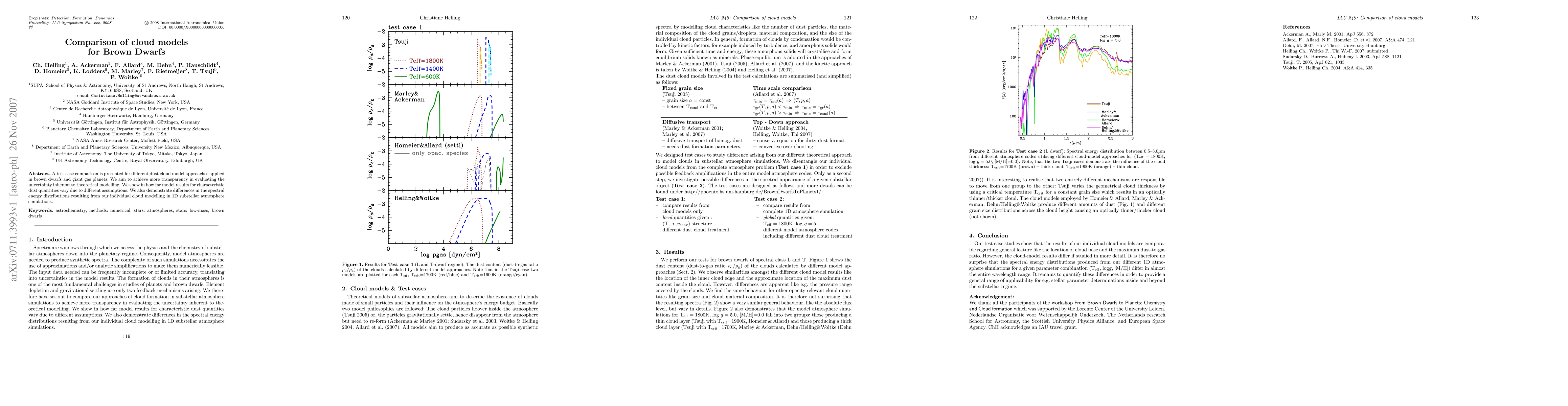 A test case comparison is presented for different dust cloud model approaches applied in brown dwarfs and giant gas planets. We aim to achieve more transparency in evaluating the uncertainty inherent to theoretical modelling. We show in how far model results for characteristic dust quantities vary due to different assumptions. We also demonstrate differences in the spectral energy distributions resulting from our individual cloud modelling in 1D substellar atmosphere simulations