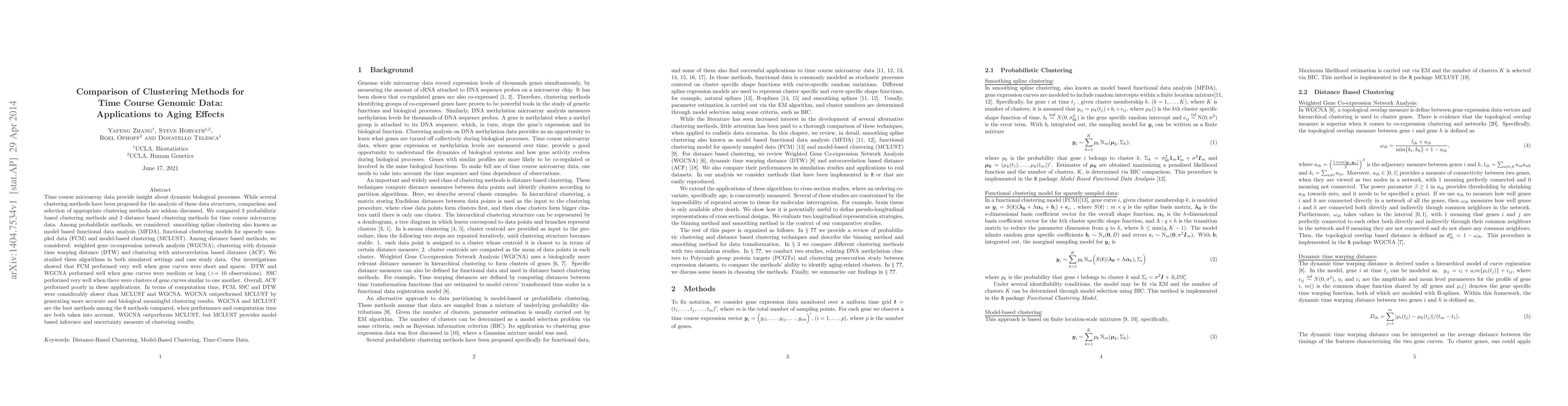This paper compares six clustering methods for time course microarray data, finding that functional clustering models (FCM) excel for short, sparse gene curves, while dynamic time warping (DTW) and weighted gene co-expression network analysis (WGCNA) perform well for medium to long gene curves. WGCNA ultimately outperforms other methods in accuracy and biological relevance, while model-based clustering (MCLUST) offers useful uncertainty measures.
