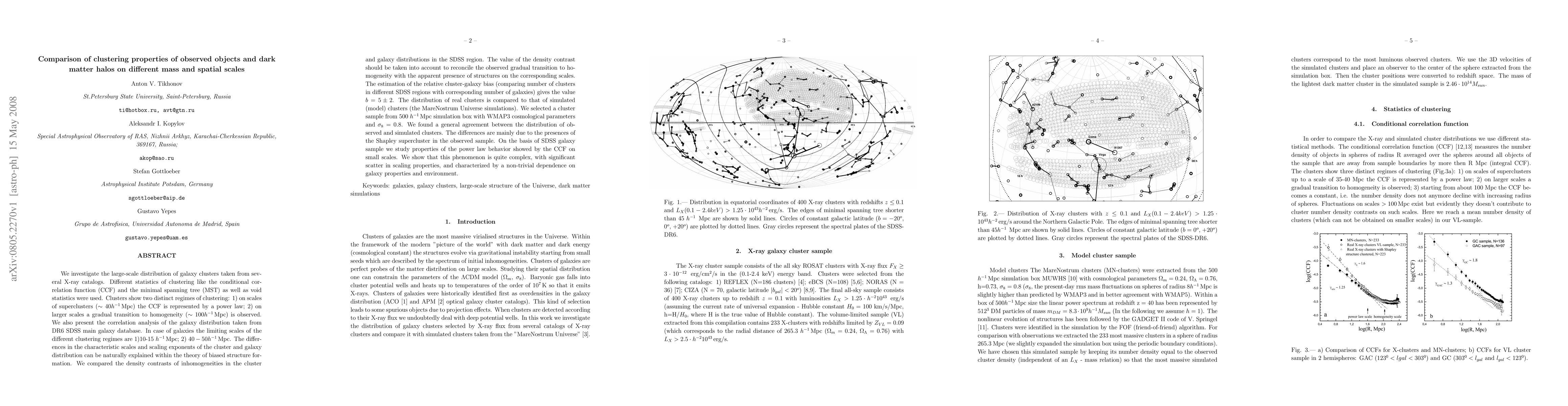 We investigate the large-scale distribution of galaxy clusters taken from several X-ray catalogs. Different statistics of clustering like the conditional correlation function (CCF) and the minimal spanning tree (MST) as well as void statistics were used. Clusters show two distinct regimes of clustering: 1) on scales of superclusters (~40/h Mpc) the CCF is represented by a power law; 2) on larger scales a gradual transition to homogeneity (~100/h Mpc) is observed. We also present the correlation analysis of the galaxy distribution taken from DR6 SDSS main galaxy database. In case of galaxies the limiting scales of the different clustering regimes are 1)10-15/h Mpc; 2) 40-50/h Mpc. The differences in the characteristic scales and scaling exponents of the cluster and galaxy distribution can be naturally explained within the theory of biased structure formation. We compared the density contrasts of inhomogeneities in the cluster and galaxy distributions in the SDSS region. The estimation of the relative cluster-galaxy bias gives the value b = 5 +/- 2. The distribution of real clusters is compared to that of simulated (model) clusters (the MareNostrum Universe simulations). We selected a cluster sample from 500/h Mpc simulation box with WMAP3 cosmological parameters and sigma_8 = 0.8. We found a general agreement between the distribution of observed and simulated clusters. The differences are mainly due to the presences of the Shapley supercluster in the observed sample. On the basis of SDSS galaxy sample we study properties of the power law behavior showed by the CCF on small scales. We show that this phenomenon is quite complex, with significant scatter in scaling properties, and characterized by a non-trivial dependence on galaxy properties and environment.