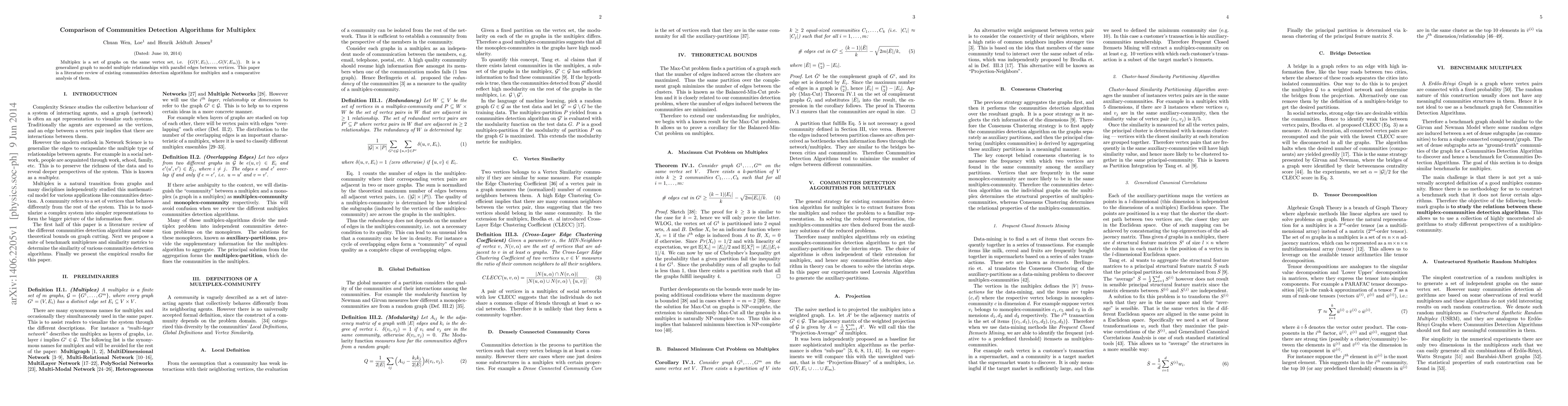 Multiplex is a set of graphs on the same vertex set, i.e. $\{G(V,E_1),\ldots,G(V,E_m)\}$. It is a generalized graph to model multiple relationships with parallel edges between vertices. This paper is a literature review of existing communities detection algorithms for multiplex and a comparative analysis of them.
