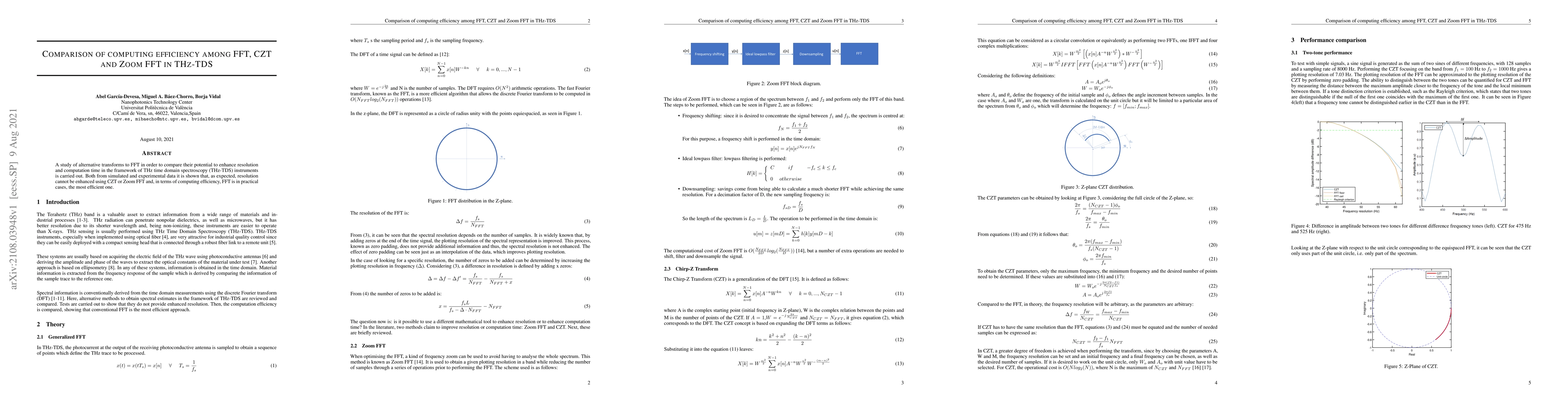 A study of alternative transforms to FFT in order to compare their potential to enhance resolution and computation time in the framework of THz time domain spectroscopy (THz-TDS) instruments is carried out. Both from simulated and experimental data it is shown that, as expected, resolution cannot be enhanced using CZT or Zoom FFT and, in terms of computing efficiency, FFT is in practical cases, the most efficient one.