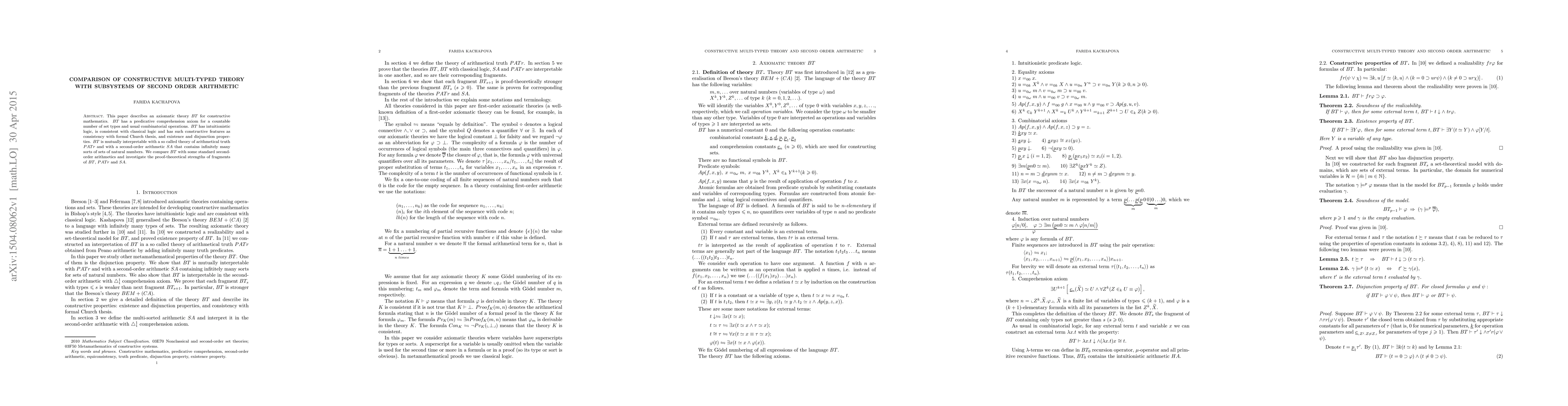 This paper compares a constructive multi-typed theory (BT) with subsystems of second-order arithmetic, highlighting its mutual interpretability and proof-theoretical strengths in classical logic and constructive mathematics.