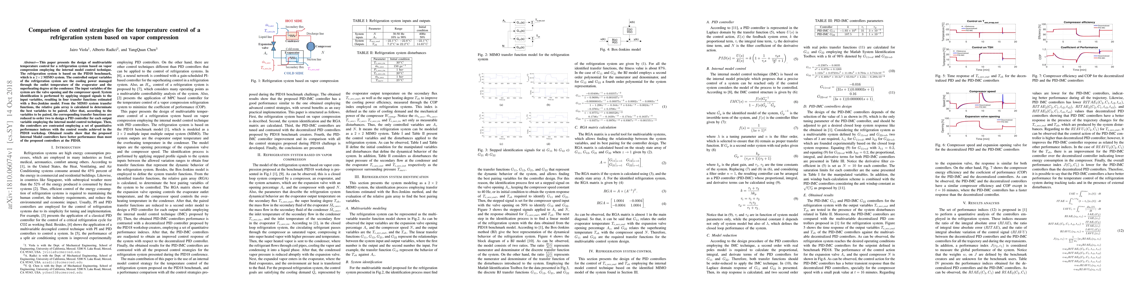 This paper designs multivariable temperature control for a vapor compression refrigeration system using internal model control, achieving superior performance compared to PID controllers based on quantitative performance indexes. The study employs system identification and relative gain array analysis to optimize control strategies.