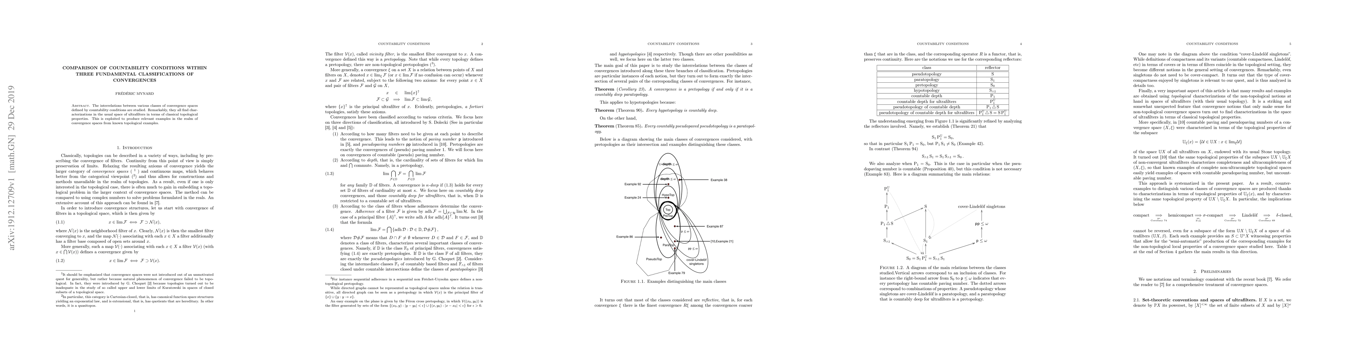 The interrelations between various classes of convergence spaces defined by countability conditions are studied. Remarkably, they all find characterizations in the usual space of ultrafilters in terms of classical topological properties. This is exploited to produce relevant examples in the realm of convergence spaces from known topological examples.