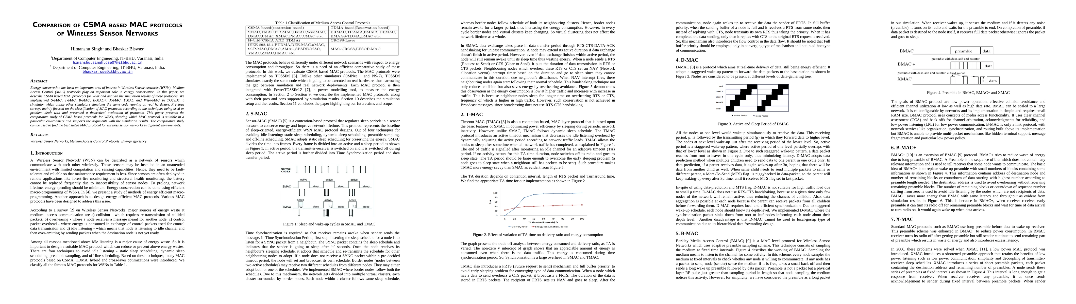 This paper compares various CSMA-based MAC protocols for wireless sensor networks, implementing and simulating S-MAC, T-MAC, B-MAC, B-MAC+, X-MAC, DMAC, and Wise-MAC in TOSSIM. The study aims to identify the most energy-efficient protocol for different environments based on simulation results.