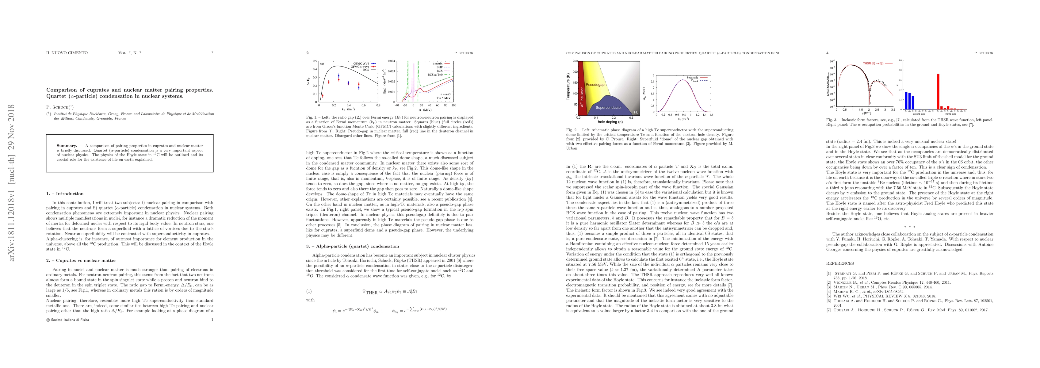 Summary: This paper compares the pairing properties of cuprates and nuclear matter, focusing on quartet (alpha-particle) condensation in nuclear systems. It highlights the significance of the Hoyle state in carbon-12 and its essential role in supporting life on Earth.