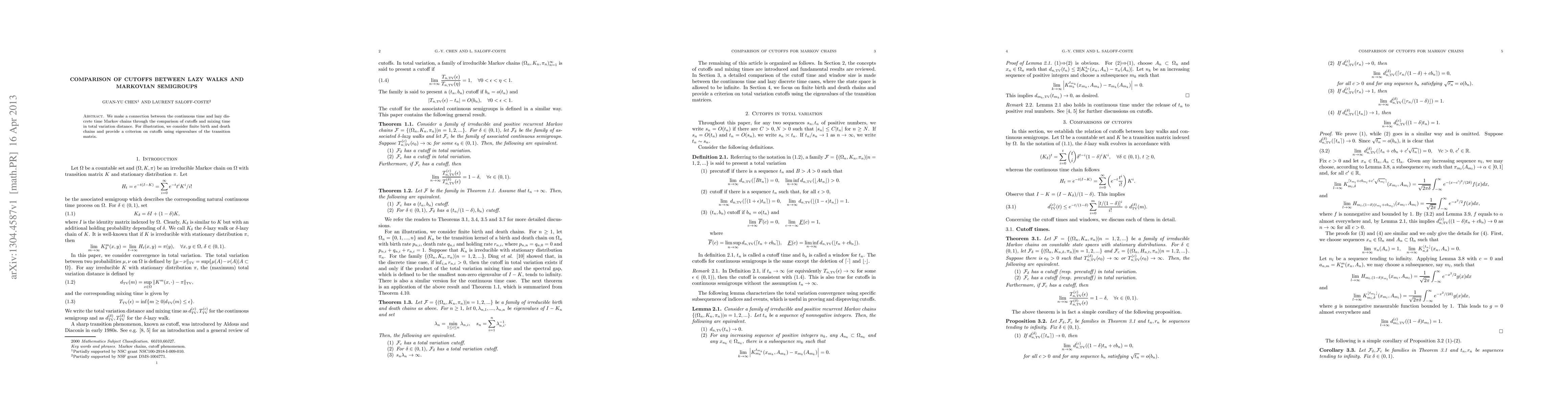 This paper establishes a link between lazy walks and Markovian semigroups by comparing their cutoffs and mixing times in total variation distance, using eigenvalues of the transition matrix to provide criteria for cutoffs in finite birth and death chains.