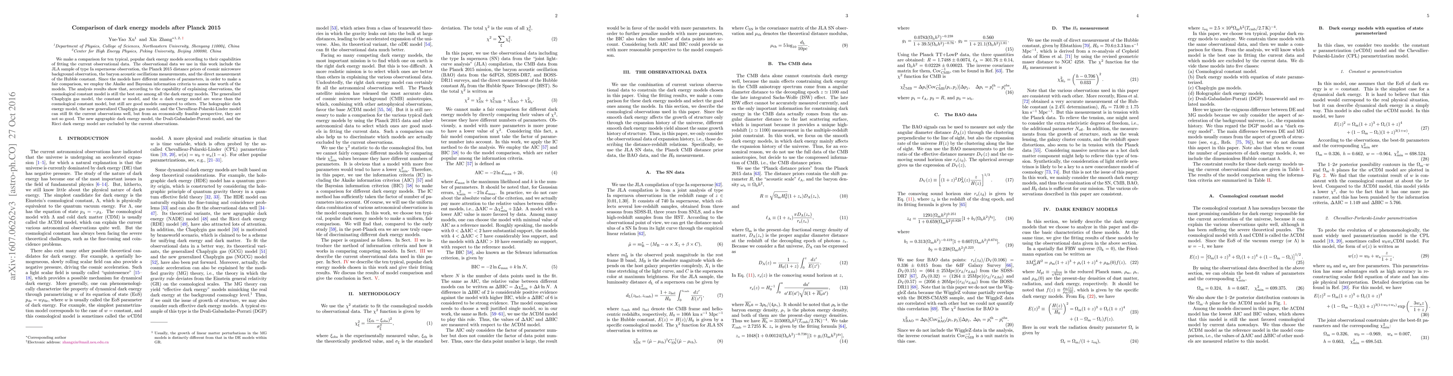 This paper compares ten popular dark energy models using observational data including supernovae, CMB, baryon acoustic oscillations, and Hubble constant measurements. The analysis, using Akaike and Bayesian criteria, finds the cosmological constant model to be the best fit, while generalized Chaplygin gas, constant $w$, and $\alpha$ dark energy models are also viable but less optimal. Some models fit observations well but are less economically feasible, while others like the Dvali-Gabadadze-Porrati model are excluded.