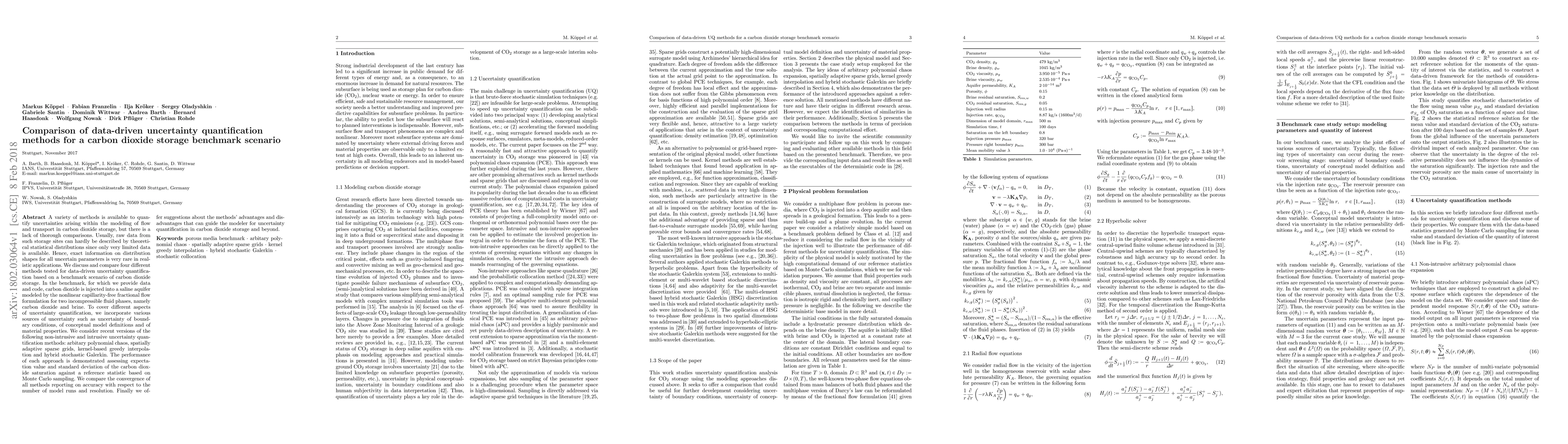 This paper compares four data-driven uncertainty quantification methods—arbitrary polynomial chaos, spatially adaptive sparse grids, kernel-based greedy interpolation, and hybrid stochastic Galerkin—applied to a benchmark scenario for carbon dioxide storage in saline aquifers. The study assesses the performance of each method in terms of accuracy and convergence, providing insights into their respective advantages and limitations for modeling uncertainties in carbon dioxide storage.