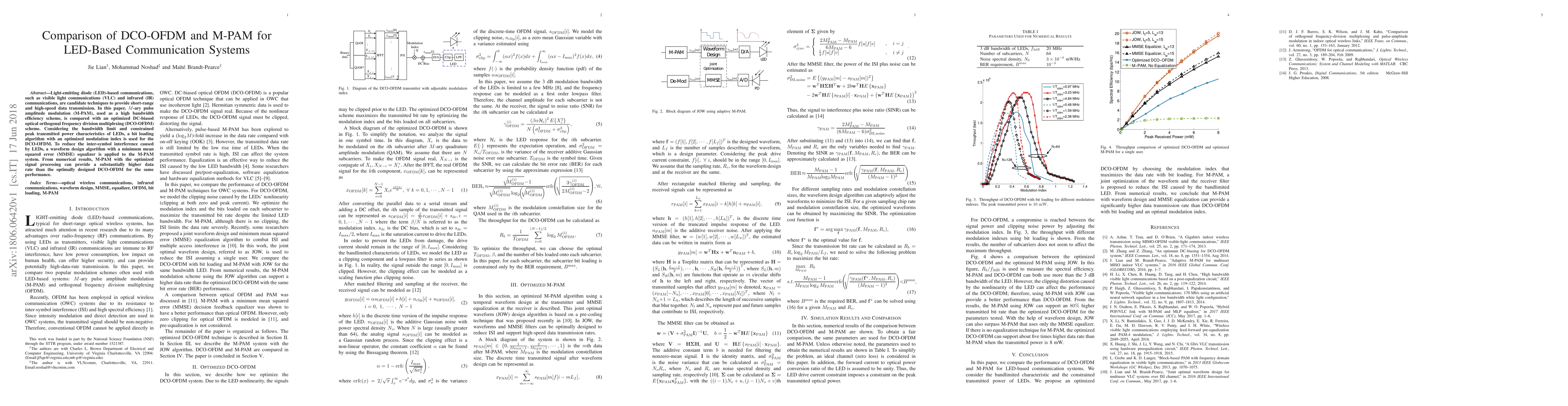 This paper compares M-ary pulse amplitude modulation (M-PAM) and DCO-OFDM for LED-based communication systems, finding that optimized M-PAM with a minimum mean squared error equalizer can achieve a higher data rate than optimized DCO-OFDM under the same conditions.