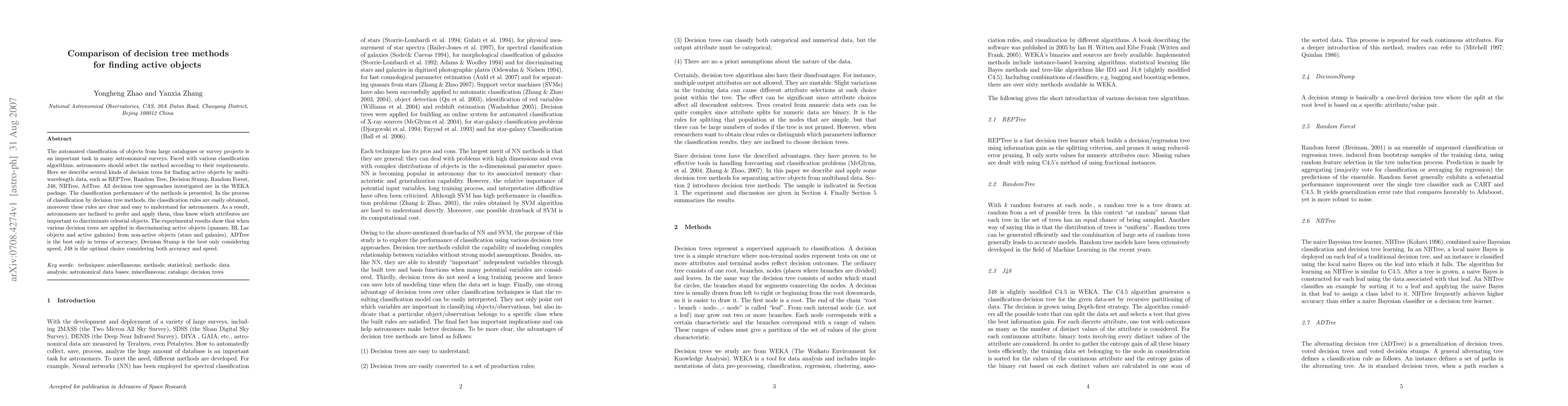 This paper compares various decision tree methods for classifying active objects in astronomical surveys using multi-wavelength data. The results indicate that ADTree offers the highest accuracy, Decision Stump the fastest processing, and J48 balances both accuracy and speed effectively.