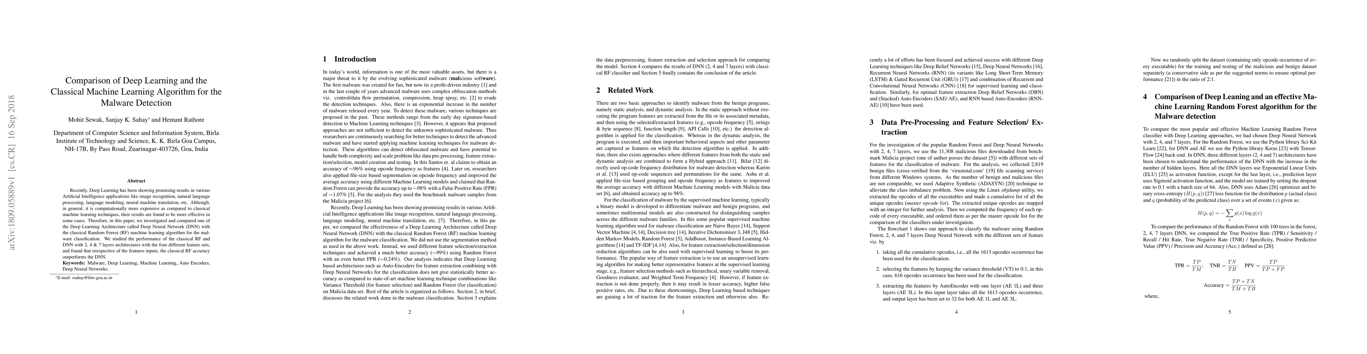 This paper compares the performance of Deep Neural Networks (DNN) in Deep Learning against Random Forest (RF) in classical machine learning for malware detection. Despite DNN's higher computational cost, the study found that RF consistently outperforms DNN across various layer architectures and feature sets.