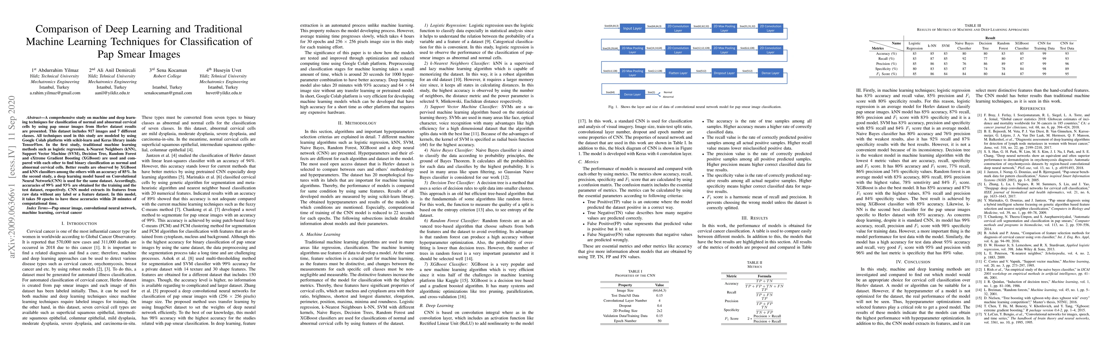A comprehensive study on machine and deep learning techniques for classification of normal and abnormal cervical cells by using pap smear images from Herlev dataset results are presented. This dataset includes 917 images and 7 different classes. All techniques used in this study are modeled by using Google Colab platform with scikit-learn and Keras library inside TensorFlow. In the first study, traditional machine learning methods such as logistic regression, k-Nearest Neighbors (kNN), Support Vector Machine (SVM), Decision Tree, Random Forest and eXtreme Gradient Boosting (XGBoost) are used and compared with each other to find binary classification as normal and abnormal cervical cells. Better results are observed by XGBoost and kNN classifiers among the others with an accuracy of 85%. In the second study, a deep learning model based on Convolutional Neural Network(CNN) is used for the same dataset. Accordingly, accuracies of 99% and 93% are obtained for the training and the test dataset, respectively. In this model, it takes 50 epochs to have these accuracies within 20 minutes of computational time.