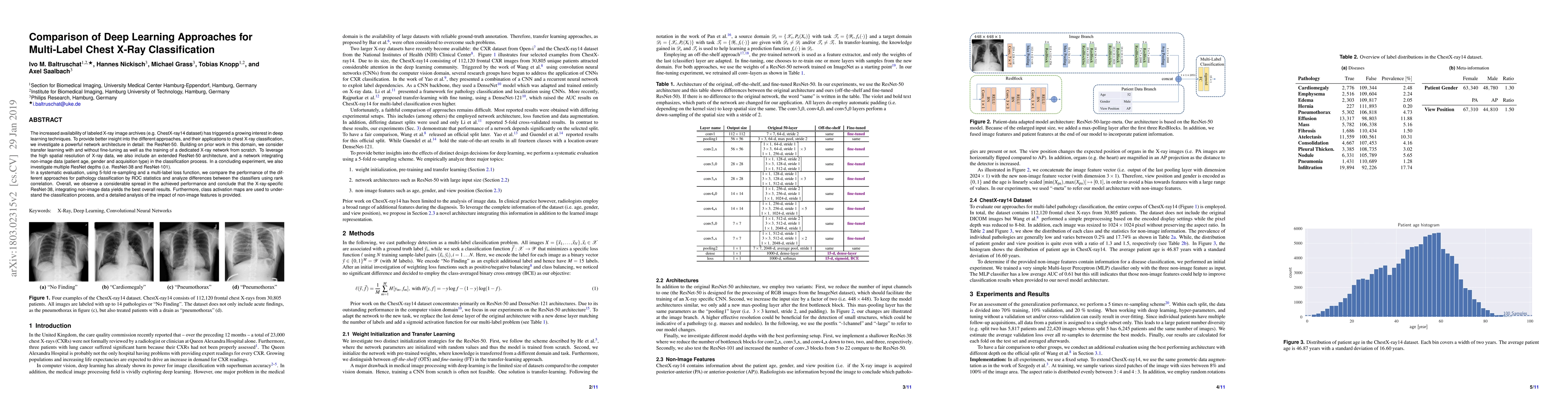 This paper compares deep learning approaches for multi-label chest X-ray classification using various ResNet architectures, including transfer learning and integration of non-image data. The study finds that the X-ray-specific ResNet-38 with additional patient features yields the best performance, highlighting the importance of tailored network designs and supplementary data.