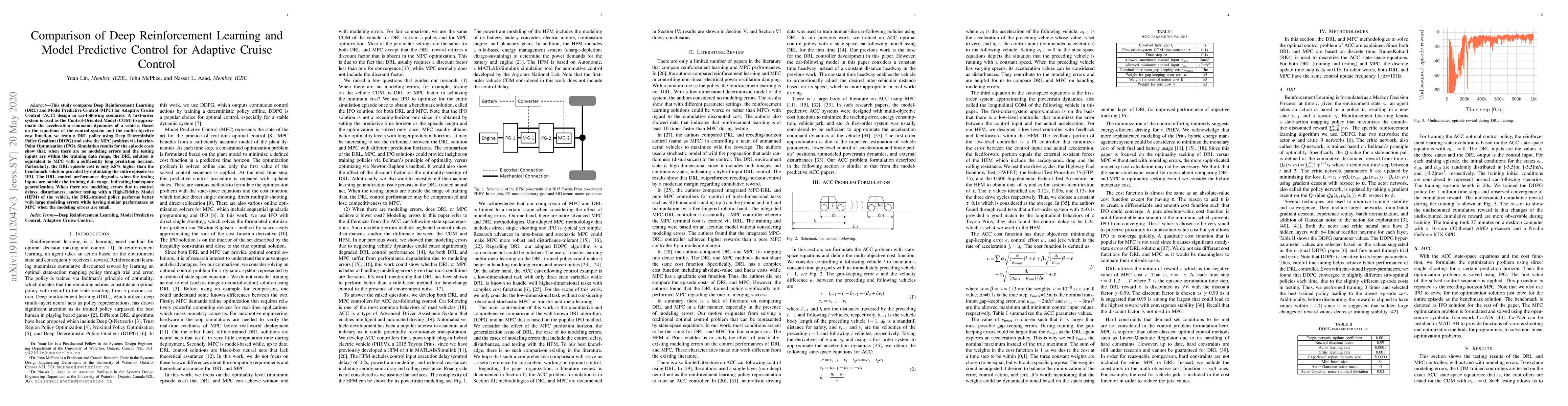 This study compares Deep Reinforcement Learning (DRL) and Model Predictive Control (MPC) for Adaptive Cruise Control (ACC) design in car-following scenarios. A first-order system is used as the Control-Oriented Model (COM) to approximate the acceleration command dynamics of a vehicle. Based on the equations of the control system and the multi-objective cost function, we train a DRL policy using Deep Deterministic Policy Gradient (DDPG) and solve the MPC problem via Interior-Point Optimization (IPO). Simulation results for the episode costs show that, when there are no modeling errors and the testing inputs are within the training data range, the DRL solution is equivalent to MPC with a sufficiently long prediction horizon. Particularly, the DRL episode cost is only 5.8% higher than the benchmark solution provided by optimizing the entire episode via IPO. The DRL control performance degrades when the testing inputs are outside the training data range, indicating inadequate generalization. When there are modeling errors due to control delays, disturbances, and/or testing with a High-Fidelity Model (HFM) of the vehicle, the DRL-trained policy performs better with large modeling errors while having similar performance as MPC when the modeling errors are small.