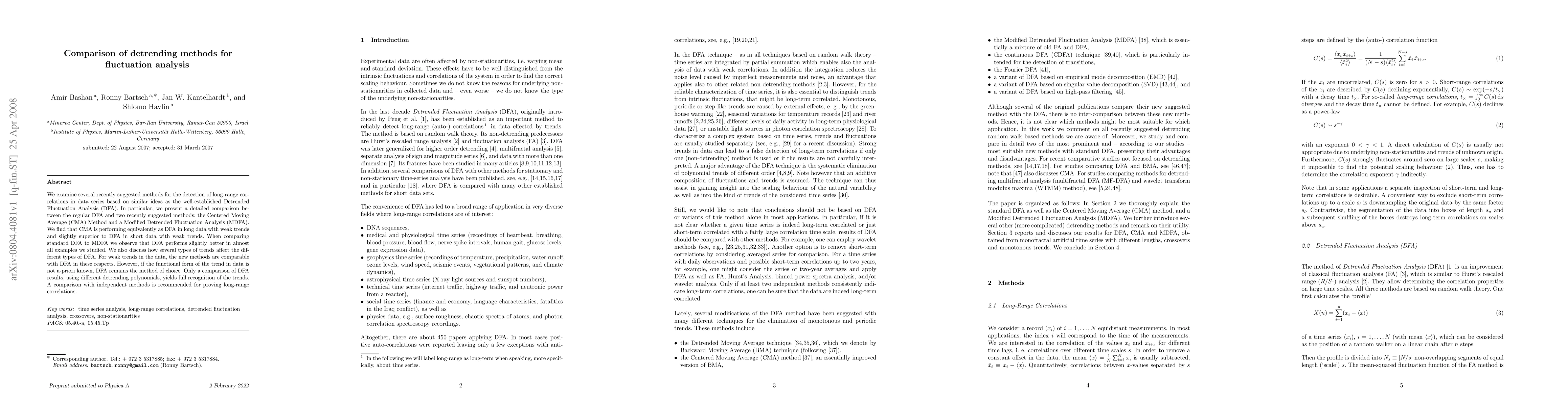 This paper compares three detrending methods for fluctuation analysis: regular DFA, CMA, and MDFA. CMA shows similar performance to DFA in long data with weak trends and slightly better in short data. DFA generally outperforms MDFA. For unknown trends, DFA is preferred, and using different detrending polynomials with DFA provides better trend recognition. Independent method validation is recommended for confirming long-range correlations.