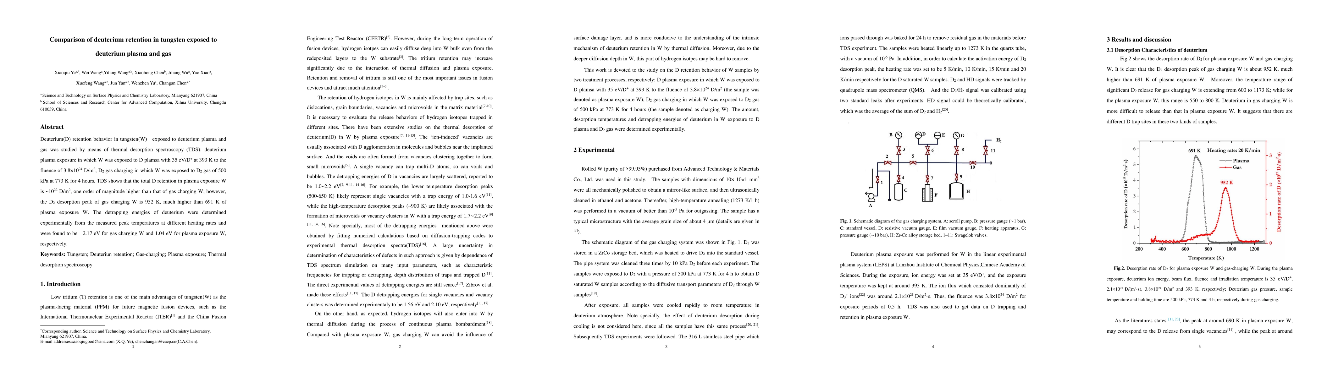 Deuterium(D) retention behavior in tungsten(W) exposed to deuterium plasma and gas was studied by means of thermal desorption spectroscopy (TDS): deuterium plasma exposure in which W was exposed to D plamsa with 35 eV/D at 393 K to the fluence of 3.8E24 D/m2; D2 gas charging in which W was exposed to D2 gas of 500 kPa at 773 K for 4 hours. TDS shows that the total D retention in plasma exposure W is 1.00E22 D/m2, one order of magnitude higher than that of gas charging W; however, the D2 desorption peak of gas charging W is 952 K, much higher than 691 K of plasma exposure W. The detrapping energies of deuterium were determined experimentally from the measured peak temperatures at different heating rates and were found to be 2.17 eV for gas charging W and 1.04 eV for plasma exposure W, respectively.