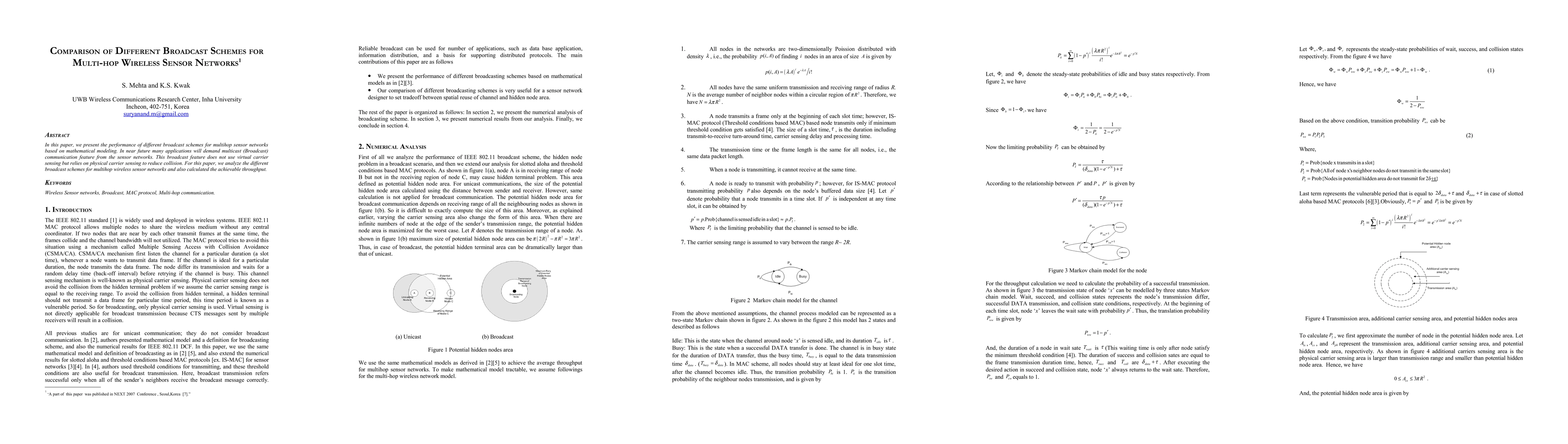 This paper evaluates various broadcast schemes for multihop wireless sensor networks using mathematical modeling, focusing on physical carrier sensing to minimize collisions and calculate achievable throughput for future multicast communication needs.