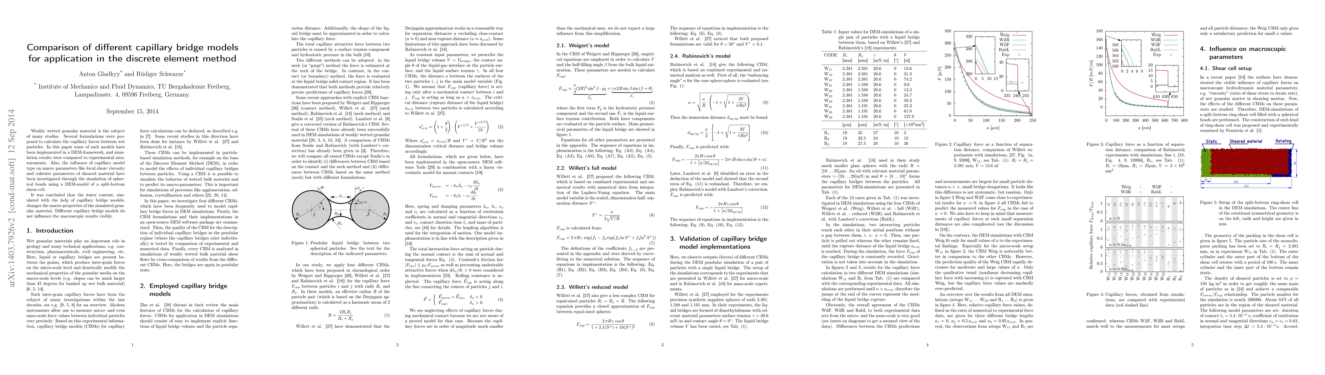Weakly wetted granular material is the subject of many studies. Several formulations were proposed to calculate the capillary forces between wet particles. In this paper some of such models have been implemented in a DEM-framework, and simulation results were compared to experimental measurements. Also, the influence of capillary model type on macro parameters like local shear viscosity and cohesive parameters of sheared material have been investigated through the simulation of spherical beads using a DEM-model of a split-bottom shear-cell. It was concluded that the water content, simulated with the help of capillary bridge models, changes the macro-properties of the simulated granular material. Different capillary bridge models do not influence the macroscopic results visibly.