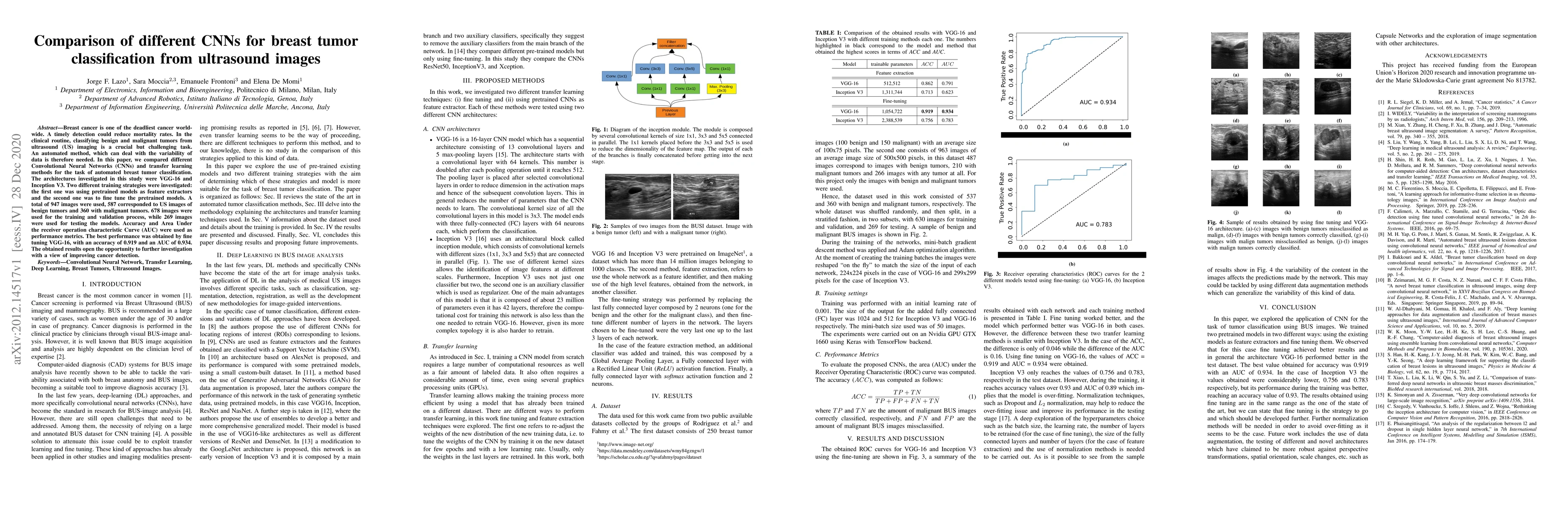 Researchers compared CNNs for breast tumor classification from ultrasound images, finding that fine-tuning VGG-16 achieved the best accuracy of 0.919 and AUC of 0.934.