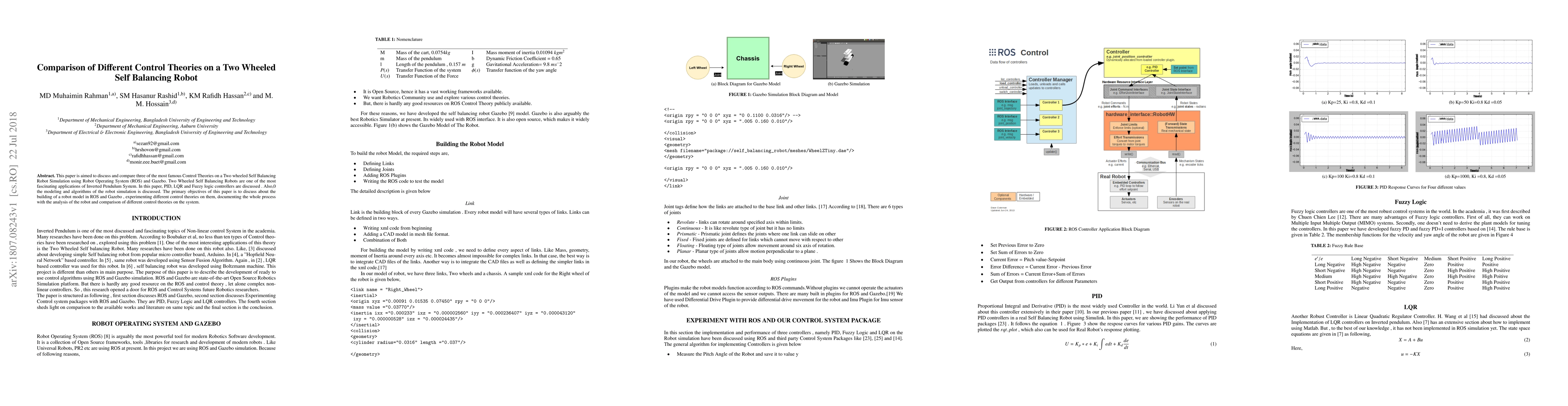 This paper compares PID, LQR, and Fuzzy logic control theories for a two-wheeled self-balancing robot simulation in ROS and Gazebo. It focuses on building the robot model and analyzing the performance of different control strategies.
