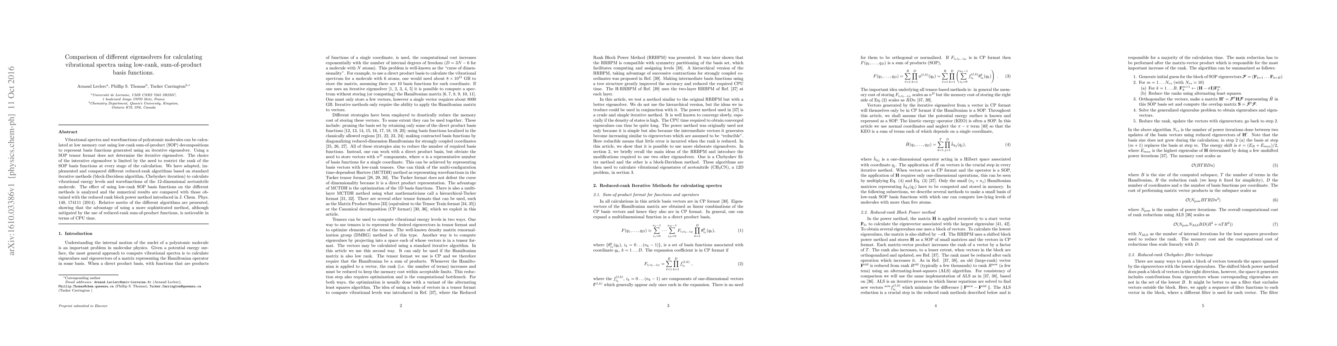 Vibrational spectra and wavefunctions of polyatomic molecules can be calculated at low memory cost using low-rank sum-of-product (SOP) decompositions to represent basis functions generated using an iterative eigensolver. Using a SOP tensor format does not determine the iterative eigensolver. The choice of the interative eigensolver is limited by the need to restrict the rank of the SOP basis functions at every stage of the calculation. We have adapted, implemented and compared different reduced-rank algorithms based on standard iterative methods (block-Davidson algorithm, Chebyshev iteration) to calculate vibrational energy levels and wavefunctions of the 12-dimensional acetonitrile molecule. The effect of using low-rank SOP basis functions on the different methods is analyzed and the numerical results are compared with those obtained with the reduced rank block power method introduced in J. Chem. Phys. 140, 174111 (2014). Relative merits of the different algorithms are presented, showing that the advantage of using a more sophisticated method, although mitigated by the use of reduced-rank sum-of-product functions, is noticeable in terms of CPU time.