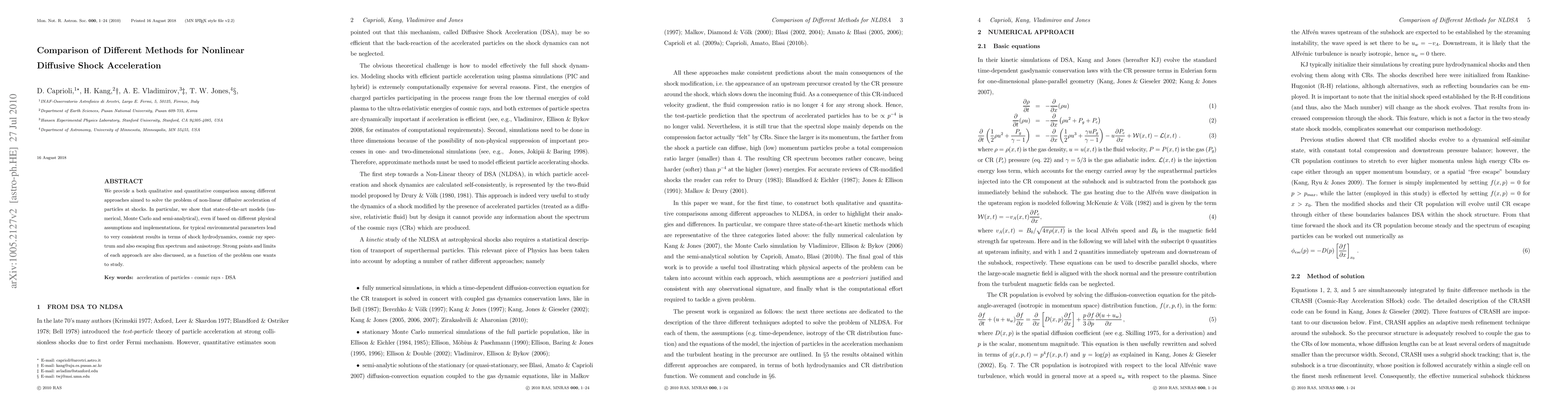 We provide a both qualitative and quantitative comparison among different approaches aimed to solve the problem of non-linear diffusive acceleration of particles at shocks. In particular, we show that state-of-the-art models (numerical, Monte Carlo and semi-analytical), even if based on different physical assumptions and implementations, for typical environmental parameters lead to very consistent results in terms of shock hydrodynamics, cosmic ray spectrum and also escaping flux spectrum and anisotropy. Strong points and limits of each approach are also discussed, as a function of the problem one wants to study.