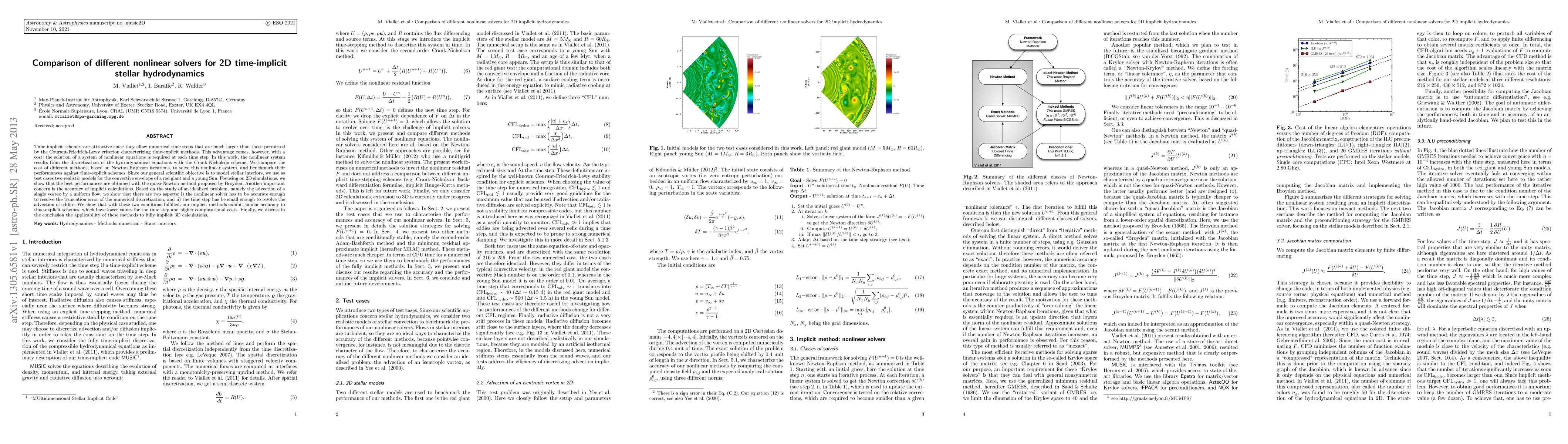 Time-implicit schemes are attractive since they allow numerical time steps that are much larger than those permitted by the Courant-Friedrich-Lewy criterion characterizing time-explicit methods. This advantage comes, however, with a cost: the solution of a system of nonlinear equations is required at each time step. In this work, the nonlinear system results from the discretization of the hydrodynamical equations with the Crank-Nicholson scheme. We compare the cost of different methods, based on Newton-Raphson iterations, to solve this nonlinear system, and benchmark their performances against time-explicit schemes. Since our general scientific objective is to model stellar interiors, we use as test cases two realistic models for the convective envelope of a red giant and a young Sun. Focusing on 2D simulations, we show that the best performances are obtained with the quasi-Newton method proposed by Broyden. Another important concern is the accuracy of implicit calculations. Based on the study of an idealized problem, namely the advection of a single vortex by a uniform flow, we show that there are two aspects: i) the nonlinear solver has to be accurate enough to resolve the truncation error of the numerical discretization, and ii) the time step has be small enough to resolve the advection of eddies. We show that with these two conditions fulfilled, our implicit methods exhibit similar accuracy to time-explicit schemes, which have lower values for the time step and higher computational costs. Finally, we discuss in the conclusion the applicability of these methods to fully implicit 3D calculations.